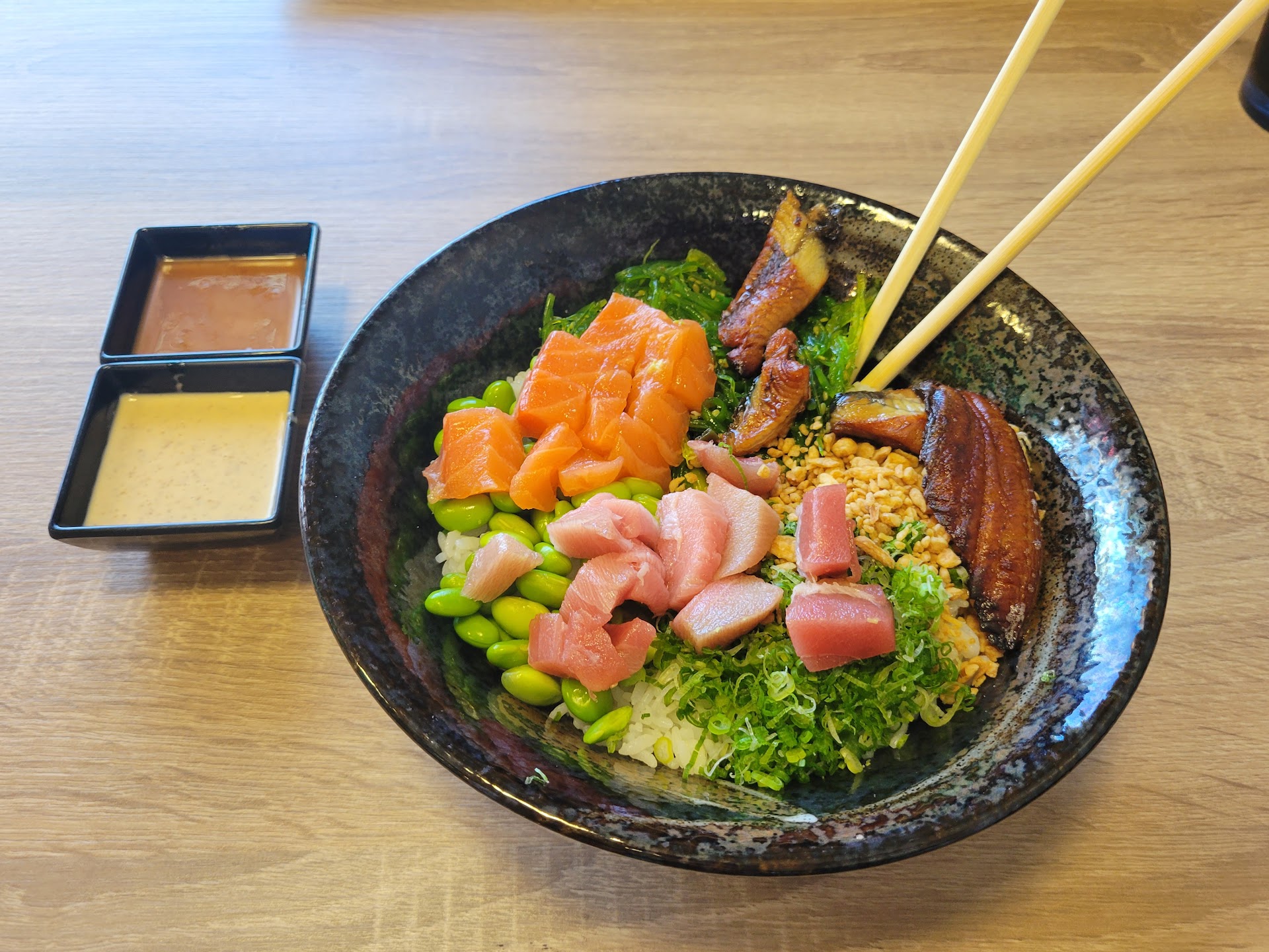 DIY poke bowl: pick a base, 3 protiens, then up to 5 toppings, and 2 sauces. I went with rice base, tuna, salmon, unagi (eel). Added edamame, crispy garlic, Seaweed salad, green onions. Sauce automatically comes to the the side and I went with the eel sauce (sweet & tangy) then creamy sesame. Mixed them both together! Delicious.