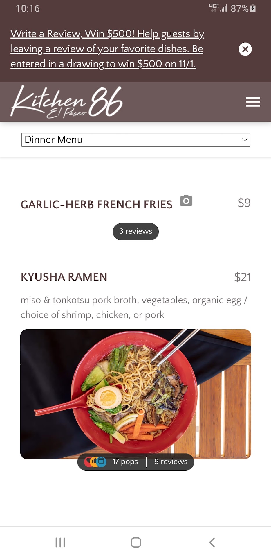 Read moreWalking down the sidewalks of El Paseo Drive on a warm Palm Desert night, I am drawn into Kitchen 86 by the sound of live music playing. Guests are seated outside on the patio socializing and swaying to the tunes. Once I pass through the doors the band is drowned out by the busy roar of conversation and glasses clinking. Happy people are cramped up to a rather small bar surrounded by equally populated high top tables, but no one seems to mind the close quarters. The lovely hostess Michelle (who has the patience of a saint) leads us through a gauntlet of drunken conversionalists, who have lost all sense of personal space, to a relatively quiet table in the restaurant section. From here I observe the live human interest story before me. I am on the fringe where I can participate without becoming involved. I enjoy fancy fungi flatbread pizza and a froofroo drink. The night is young and I am swept up in the swirl of smiling faces around me, After dinner I feel the energy of the evening follow me outside where I wave goodbye to the band and float back down the summer sidewalk... Please note: online reservations are recommended if you want a...