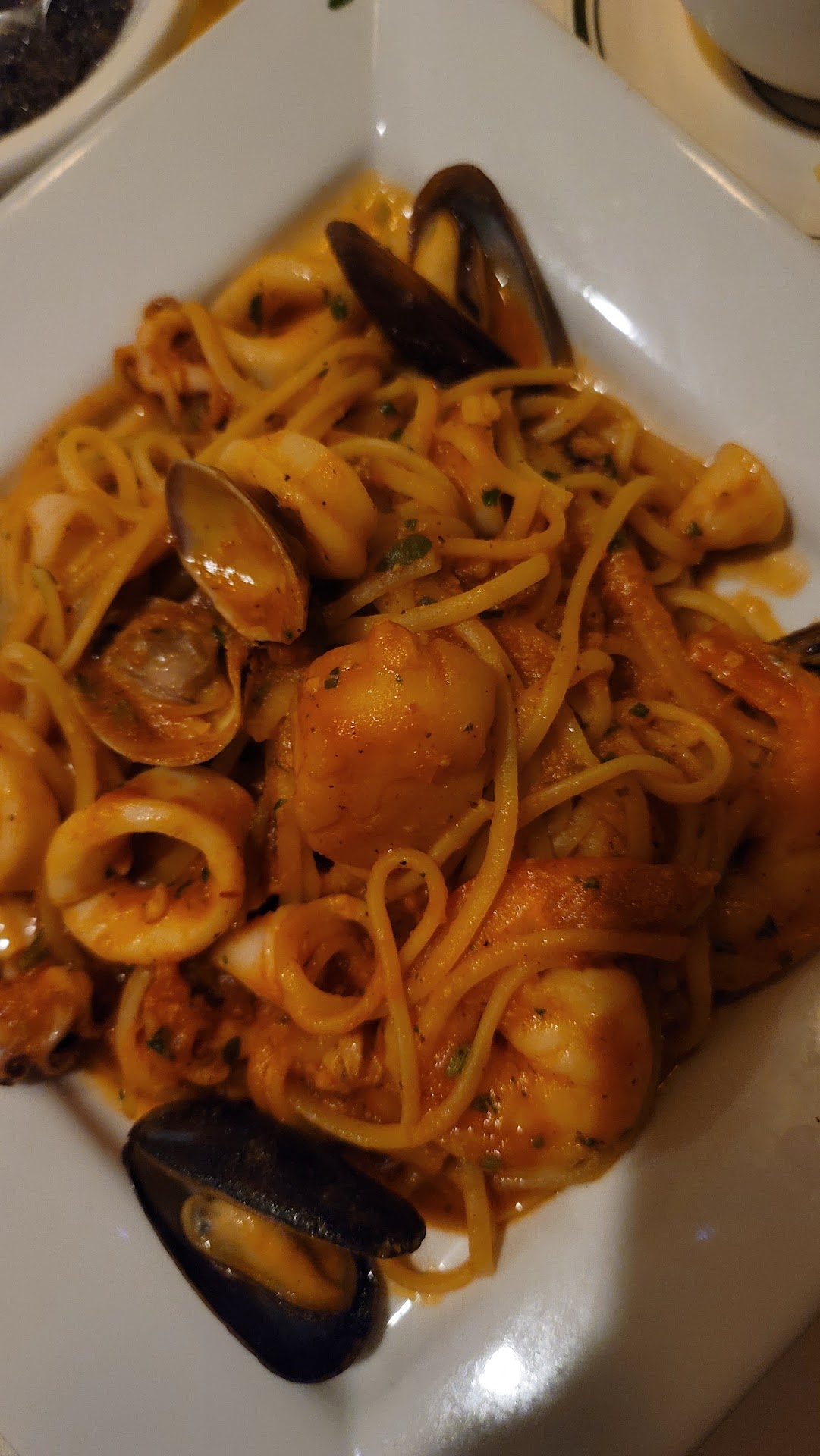 Linguine with seafood - 4-stars. It would have been great to see an option to order this without the linguine, more like a ciopinno. Flavors were perfect though and the seafood was fresh and abundant. Calamari, mussels, clams, scallops, fish, etc.
