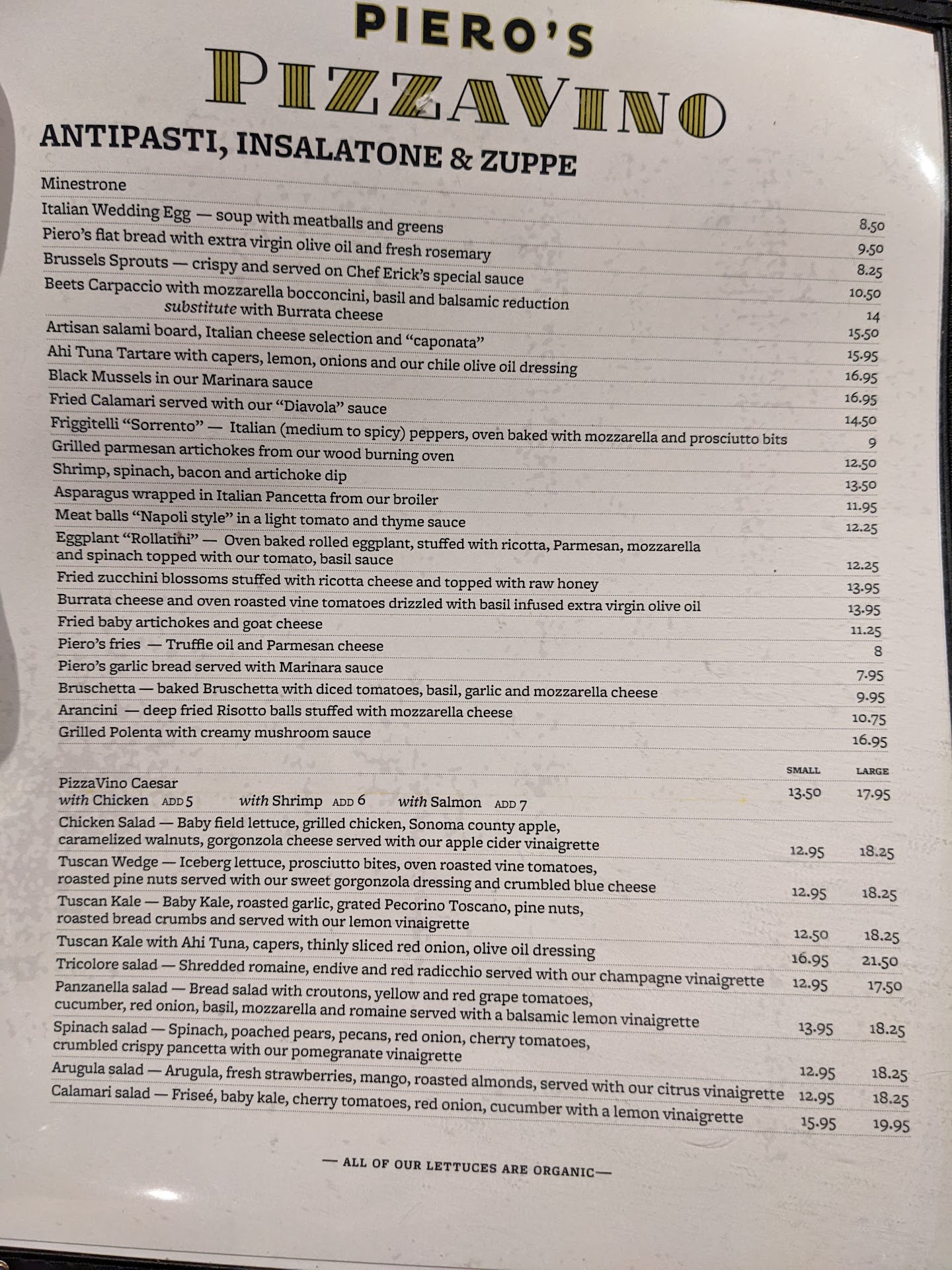Read moreUpdate 2 yrs later... Manny mgr made certain we had a positive experience this time. Reuben our server was friendly and attentive. Food was as great as last time. Large arugula salad and small panzanella and margherita pizza. The only disappointment was the flat bread appetizer that was burnt. Dined on enclosed patio. Will return next time in PD. Manny host and manager was friendly. Nice enclosed patio. Waited at least 10-15 min for Victor server to ask if we wanted water. At that point we asked for wine and beer. He was vague on what was on tap and had it backwards. He started walking away so we asked to order salads. He then asked if wanted entrees; we said we'll wait. Someone else brought salads. We waited another 10+ minutes and finally spotted Victor and waved him over and ordered pizza and another glass of wine. Forgot to order bread. Asked another another waiter for bread. Had to ask two more servers to ask Victor for my second glass of wine. The arugula and panzabella small salads and the margherita with extra sauce cheese and basil were all good. Our tip is based on service which was non existent until it was time for check. Victor actually brought the restaurant copy back and had circled the percentage tip amounts. We had NEVER had that happen before. I explained to Manny that we tip according to service and Victor's service was seriously lacking plus he returned the check with the tip % circled. Manny apologized and said to ask for him next time we're there. Victor followed us out the door and thanked us for coming like he was expecting more tip. What a...
