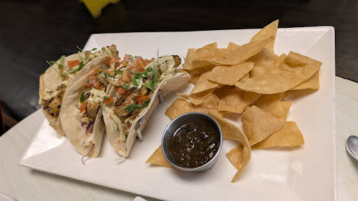 That said, the food is pretty good. We tried the chips, salsa, and guacamole (not complimentary hereā$10) and the blackened fish tacos. The chips are house-made and served warm. The guacamole was fine but not exceptional. The salsa, however, was disappointing. It had an unappealing brown color and bland flavor. I understand they're going for a roasted pepper salsa, but the burnt skins should be removed before blendingāit makes a noticeable difference.