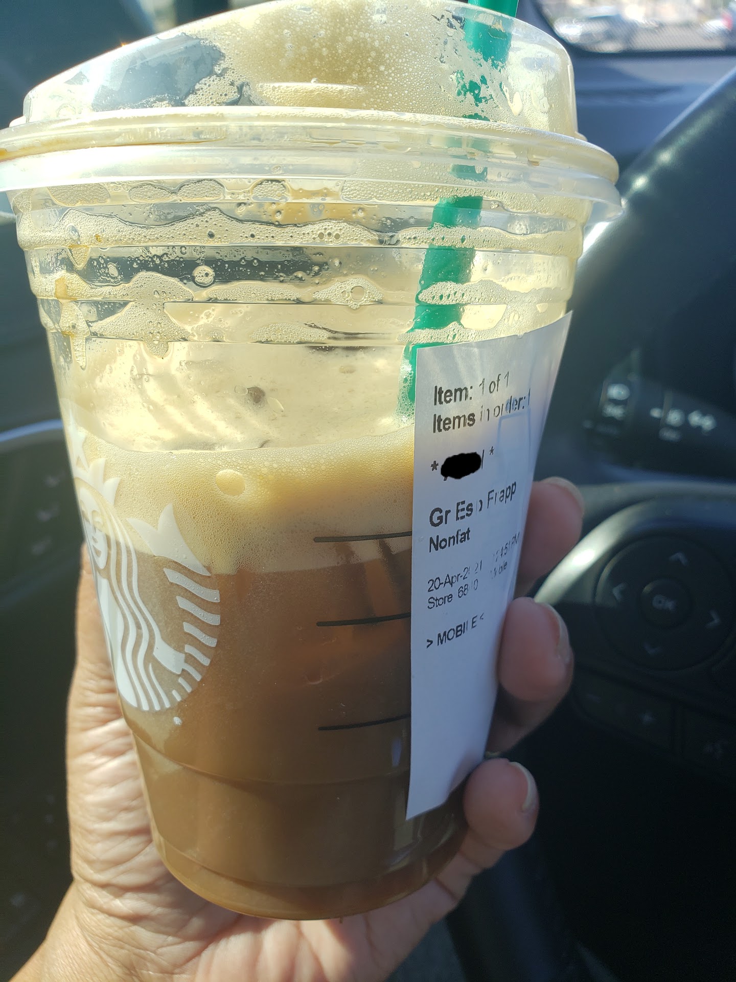 Read moreMy husband and i normally come here through DT. It’s always been good, service specifically. In fact this is the only store we go to for my ribbon crunch frappe, bc Ive always get the way i want my frapp. Today, my husband’s customer gave us extra tip so we can enjoy something to drink. It was already in my head to get a strawberry frapp. We got there at 5:55pm. First impression was, big EWW on the dirty windows and doors. 2nd observation was, NOT ONE HELLO of any of those NOT WELL TRAINED workers there! No EYE CONTACT at all! We felt like we were a burden to both of them. We go to the front counter, as usual, we both count 1-10, and if no one comes to us, we just simply LEAVE(this goes to anywhere else, they dont want our business, oh well!). And we did! We left, thanks to both! Now, we have a new fave...
