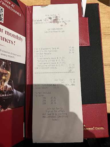 Well , i never leave a bad reviews as I do not want to hurt an overall business rating .. but ... we have been dining at carrabas at least 4 times per week for a few months plus ordering Uber eats therefore i can not stay silent ... the whole nonsense started in dec when i was sick and ordered a dinner for 4 , worth over $180 on uber eats plus tip .. it got delayed by 4 hrs .. ok ... yet when the order got delivered , everything was wrong .. appentizers, soups , main dishes .. etc.. i have called to the restaurant , and the floor manager of that night told me as soon as she picked uo that she knows that me delivery order got screwed up .. she immediately apologized and took my mailing address and name and told me that she can not refund for the deljvery order but she will send a gift card to reimburse for the wrong and missing items order . Today, we are in the end of feb and we still didnt receive it .. what a shame.. are you really that desperate that you will be screwing someone who eats 5 x week at your restaurant just so noone can blame you ?! Forget that i have paid 180 for the dinner and it was nothing that we have ordered 3.5-4 hrs later. Regardless, considering we used to eat at carrabas in palm harbor all the time , my son and i went for late lunch a few days ago just to give it another chance .. it was about 4.20 pm when we entered...The floor was empty . Our waiter didnt come until after 28 min post we got seated ( not to mention we were the only ones at the floor) . I have ordered appetizers and main course . We got 1 appetizer before drinks and bread . 30 min later i got my main course , then my son's.. 30 min later they asked if we still feel like appetizers and bread with oil .. i mean are you kidding me .. few waitresses on the floor were laughing about the situation and apologized ?? Yet you are serving me the main course , which tasted absolutely tasteless .. lack of spices, no saly and pepper.. very blah.... same for my son .. we both hardly have eaten the food and then you ar3 finally offering mr my appetizers and 16oz of wine ?! Really?! Ridiculous ... everything got to waste , yet i have still paid and real expensive ine thing is real strange to me ... .With the current economy, people want to come to your place to dine in like before and have a peace if mind and distract grom all the chaos in the countey ... but you seem to care less ?! Just collect the money , scam , serve wrong and nasty and let it go ..mm .. How noce ?!...