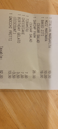 Read moreOn our first time here everything was fantastic, service was good, and food was delicious. It was only natural that we take our daughter here on her birthday. What a disappointing and terrible decision. Not only was the food a big miss, but service was terrible. The Server only came by while making her rounds to all the tables. We ordered some appetizers and she asked about the entres. I asked the server to just put in the appetizer order right away as my daughter was starving. She was not feeling well and needed some food but the server went straight to the next table to take their order. Later she brought a pitcher of water over and filled my wife and daughter's water glasses, but only their two water glasses while my water glass was almost completely empty she just skipped right past my glass but then made her round directly to the next table and gave them water. We had to ask two people for butter, and it took 20 minutes to get it! The appetizer special was justvawful, the breading on the shrimp just slid right off and some of the shrimp wasn't cooked enough. Hardly any dressing on the Ceasar Salad, it was so dry! It was such an entirely different experience from both the front and back of the house from only just a couple of weeks ago. So time for dessert and we order and at least they brought a candle. Then the check comes, and there's a charge for a birthday gelato and a credit for the birthday gelato. Most places would give the birthday child a free dessert of their choice, but if not, at least they would tell you if they do something at all. To say well that's all they do would be fine if at least you would have told us before ordering. No mention of anything except to put it on the check!!! Way to bump up the bill by 7 dollars but lose a customer in the process. But it isn't the 7 dollars as I would have ordered whatever she wanted and paid for it wothout a problem. Except it would have been proper to at least tell us. We wouldn't have even known about the Birthday Gelato if we didn't question what was on the check! Birthday Gelato 3.50 on the bill discount -3.50 on the bill, No mention of the gelato No gelato on the table And...