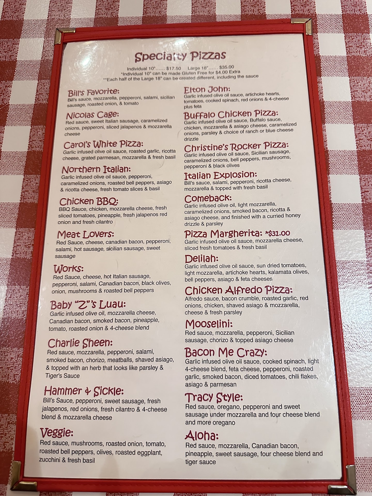 *Charlie Sheen: red pizza topped with pepperoni, salami, bacon, chorizo, meatballs— super meaty pizza with great flavoring.