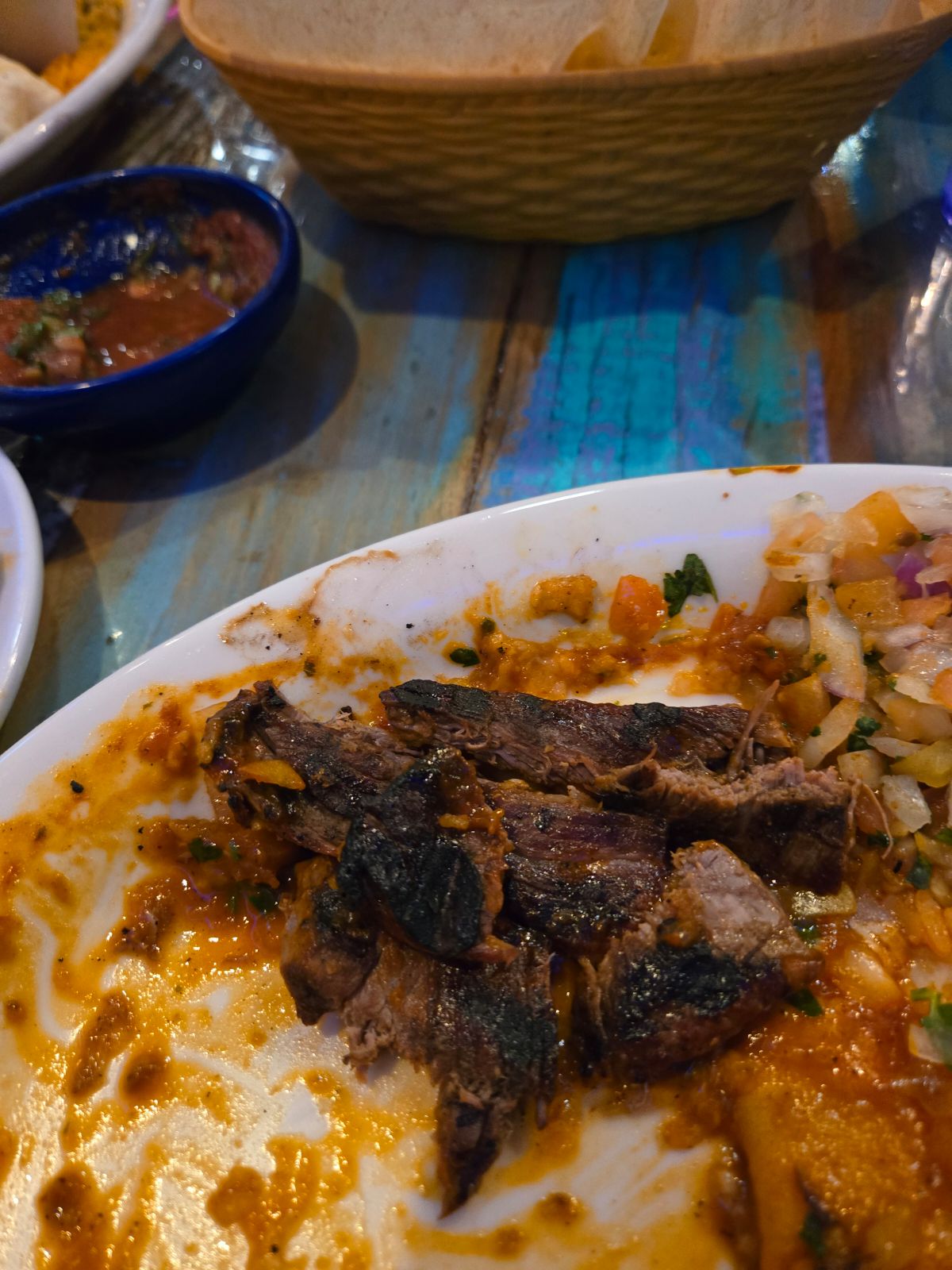 Read moreTradition No Mas! So we've been going here for many many years, last time right before Covid and always excellent. So naturally when we planned a trip to Palm Springs, we planned a dinner here. So chips and salsa great ..just spicy enough. Had a side of fresh homemade guacamole also great! Server was great, fast drink order and always checking in. So my wife ordered a Carne Asada Steak Platter, asked for Medium Rare, what arrived was maybe medium towards well done. She didn't want to send it back saying the flavor will make up for it... that's her secret Code for I don't want to send it back because I don't want the cook to add a "special sauce" for daring to return it...oh geez she's seen too many shows! After trying desperately to get a couple bites worth eating, she flipped over the meat and well looks like someone took a blowtorch to it. She enjoyed the rice and beans instead... y'all know I'll hear about this for awhile : - (. I ordered a Shrimp Fajita Burrito, huge beast with beans and rice on the plate. Had decent amount of very tasty shrimp, sweet onions, peppers and lots more rice and beans geez. However, to cut into this burrito takes a knife using some serious pushing and sawing...WTH?! After a couple chewy bites, I thought it best to just open it and pic through the insides. The tortilla well....I should've taken it as a to-go and given it to my Husky. He would have enjoyed it as a challenging chew toy!! In short...this Traditional stop is a RIP for us...I can only advise you try Taco Bell,...