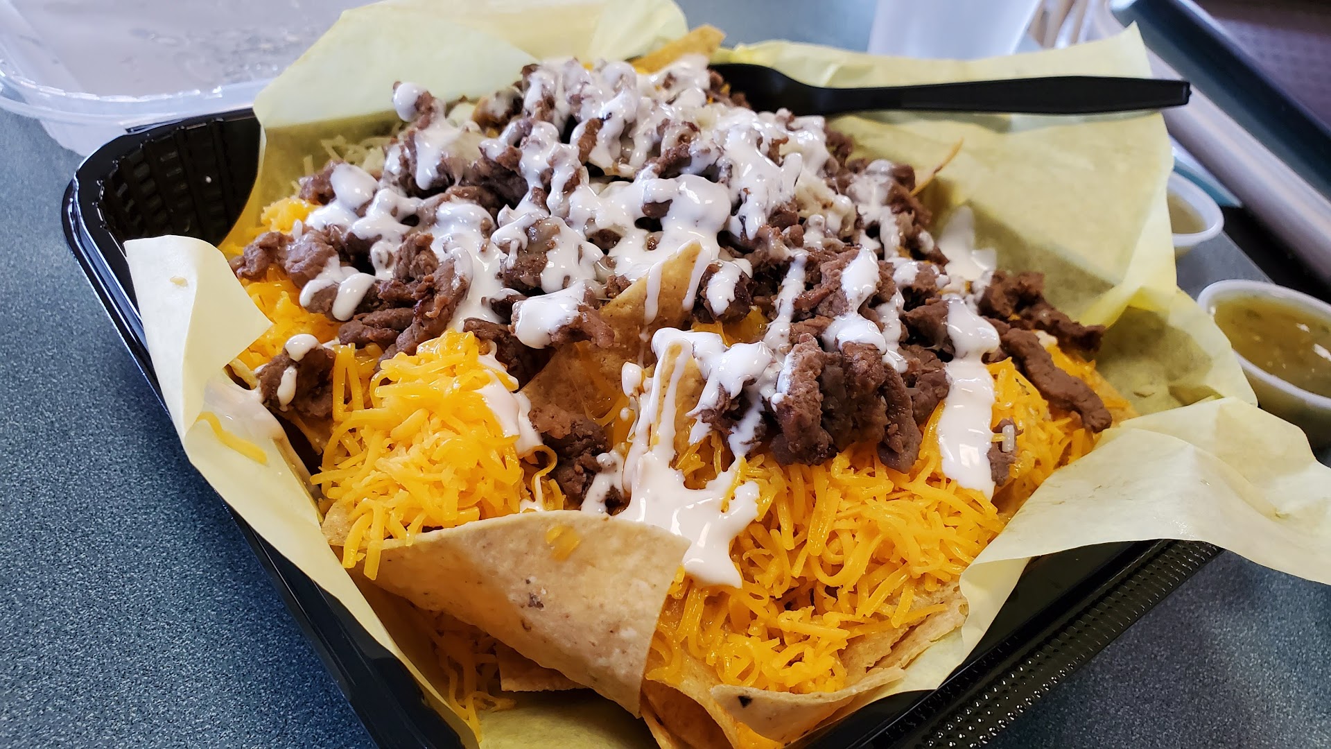 Read moreSo I ordered one order of carne asada fries and it was absolutely disappointing. The customer service was okay but the food quality and overall presentation left more than something to be desired. The french fries were somehow underdone and yet brown as if left out for days or cooked in very old oil. This was more than bad this was disgusting. The fries were swimming and some type of cream not sour cream consistency but genuine cream and their avocado sauce did not taste like avocados at all It tasted more like a zucchini of some type. Genuinely nowhere near the consistency of guacamole but definitely the consistency of what looked like green vomit. 🤢 So I took them back to get a supposedly better order only to find that they had served me the exact same dish all over again. When I asked her why my French fries were brown she said it's just a type of fries we have. I don't know about you but I've never seen a potato that is brown on the inside‽ And again it was like chugging a gallon of oil down. The cheese was the best part and that's saying something. Don't believe me look at the picture below of the supposed better product that they...