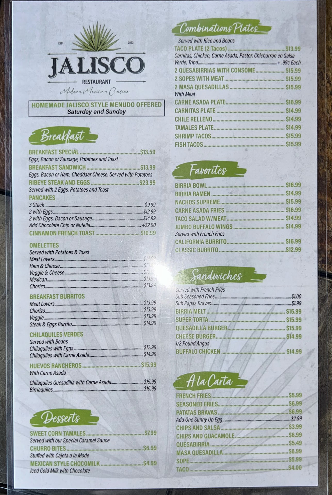 Definitely a must! Jalisco Breakfast and Mexican Food in North Palm Springs is an absolute hidden gem that truly delivers on all fronts. From the moment I stepped in, the friendly and helpful staff created an inviting atmosphere that set the stage for an exceptional dining experience. Donât let the outside deceive you! YOU HAVE TO EAT HERE :) The birria plate and birriaquiles were nothing short of amazing, showcasing the kitchen's dedication to authentic Mexican flavors. The nachos and menudo definitely hit the spot as well. The familyâs genuine enthusiasm for their culinary offerings added an extra layer of warmth to the entire meal. Their recommendations and attentive service elevated the dining experience, making it not just a meal but a memorable journey into Mexican cuisine. For those seeking not only exceptional food but also a welcoming environment, Jalisco Breakfast and Mexican Food is where itâs at. I highly recommend this spot where warmth, flavor, and friendliness come together for a delightful dining experience. Try the aguas frescas and definitely have dessert :) Weâre coming back before our trip is over. The locals are lucky to have this restaurant in their...