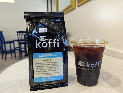 I was not in the shop long to give as detailed of a review. I got there an hour before closing, and fyi they have two entrances, in the front and along the side of the building. There were at least a dozen people spread about both sides of the shop, but it felt calm, and there wasn't a line to order. The barista was friendly, and my order was straightforward. If you've never had a coffee from here, their cold brew is foolproof. It has chocolatey notes that go down smoothly and with little acidity. I got it with hazelnut and added cream. As I think about it, the cold brew is the only thing I recall ordering when I do get the opportunity to pop into any of their 4 to 5 locations. Previously, it may have been a regular iced coffee with my preferred flavoring. The one located near the PS strip can be overwhelming crowd wise, and parking is also a pain to find (perhaps during the summer this isn't an issue). I enjoy and find this location and the one in Cat City, the most approachable locations, because they aren't as impacted by our tourism. They sell their own coffee beans whole if you'd like to take home a bag, and I saw a variety of snacks in their cooler, varying from yogurt parfaits to sandwiches. I'd definitely recommend Koffi over any of those well-known franchises. It's a shame their isn't a location in Indio, so I...