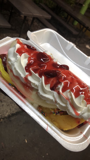 But let's talk about the banana split â a masterpiece of simplicity and indulgence. Served in a humble paper cup, it's a sight to behold: ripe bananas nestled between scoops of creamy vanilla ice cream, drizzled with rich chocolate sauce, and crowned with a cloud of whipped cream and a cherry on top. It's a symphony of flavors and textures that dances on the taste buds with every bite.