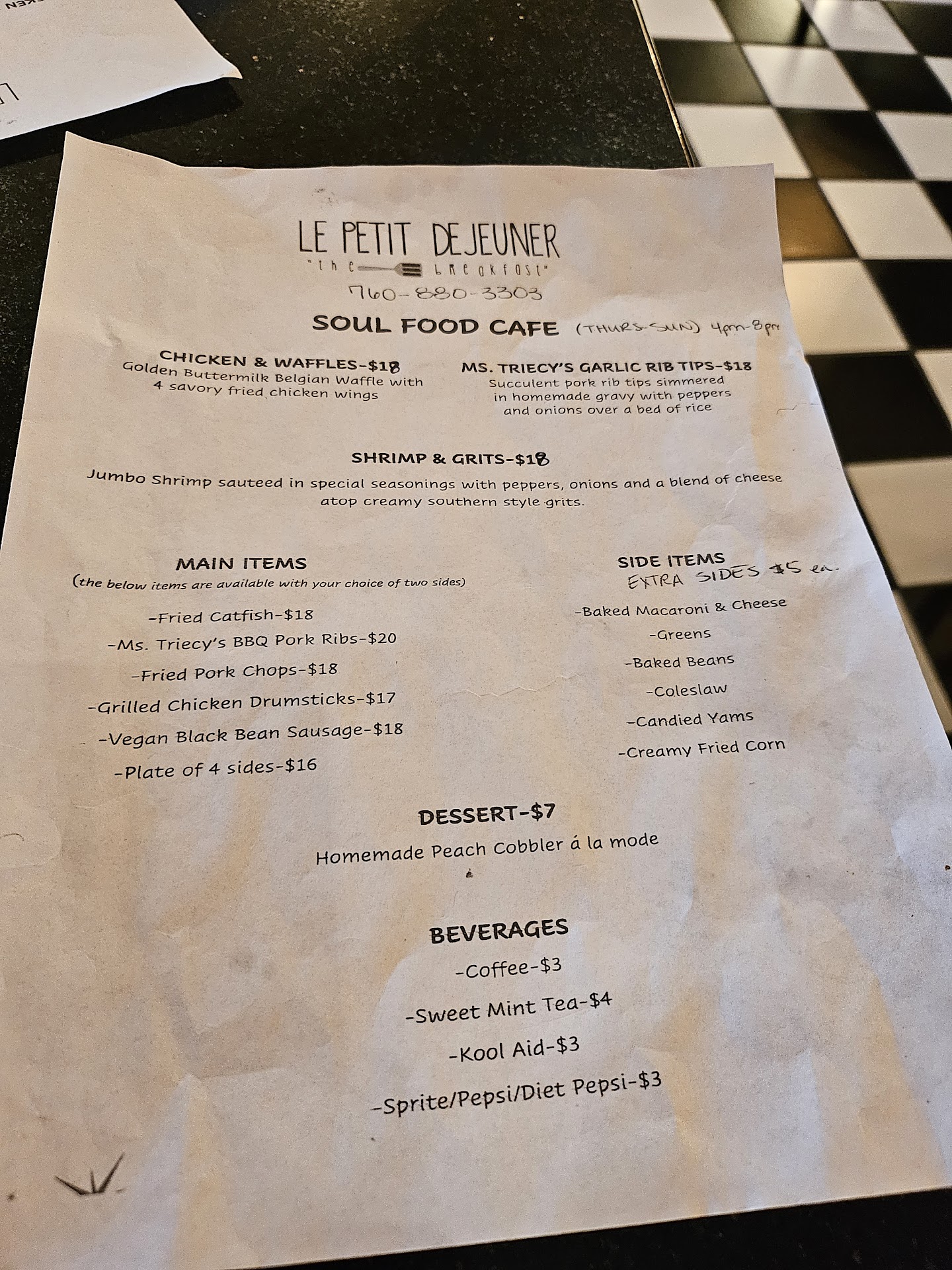 I really wanted to like this place and I did but there are changes I would make. The servers are friendly enough, they just didn't seem to be very experienced but again very friendly and the orders came out correctly. My partner ordered the pork chops with the Mac & cheese and cream corn(you pick 2 sides with entree)and he enjoyed everything. I had the very misleading black bean sausage with greens, rice & gravy and an extra side of candied yams. The "sausage" was just a black bean and rice mixture that looked shaped by a cookie cutter into a couple of little circles. When the owner came to check on us, as she did every table(a very nice touch)I suggested the "sausage" just be served in a dish as a side because other guests will also likely be disappointed thinking they will get something that they won't. Everything I had was really good however the yams are very very sweet. I also ordered the peach cobbler which was the pie cobbler and not the cake cobbler consistency(IYKYK)it was also good but I would have appreciated a better presentation and it being warmed throughout. I won't say the price point is too high (about $22 a person)but at the current level I believe the cornbread should come with an entree. This may be nitpicky but being able to hear the staff talking in the kitchen from the dining area was not the vibe. Overall I will return to this place because the valley definitely needs food diversity and I love supporting small and Black businesses. I am rooting for this one to succeed in order to make the...