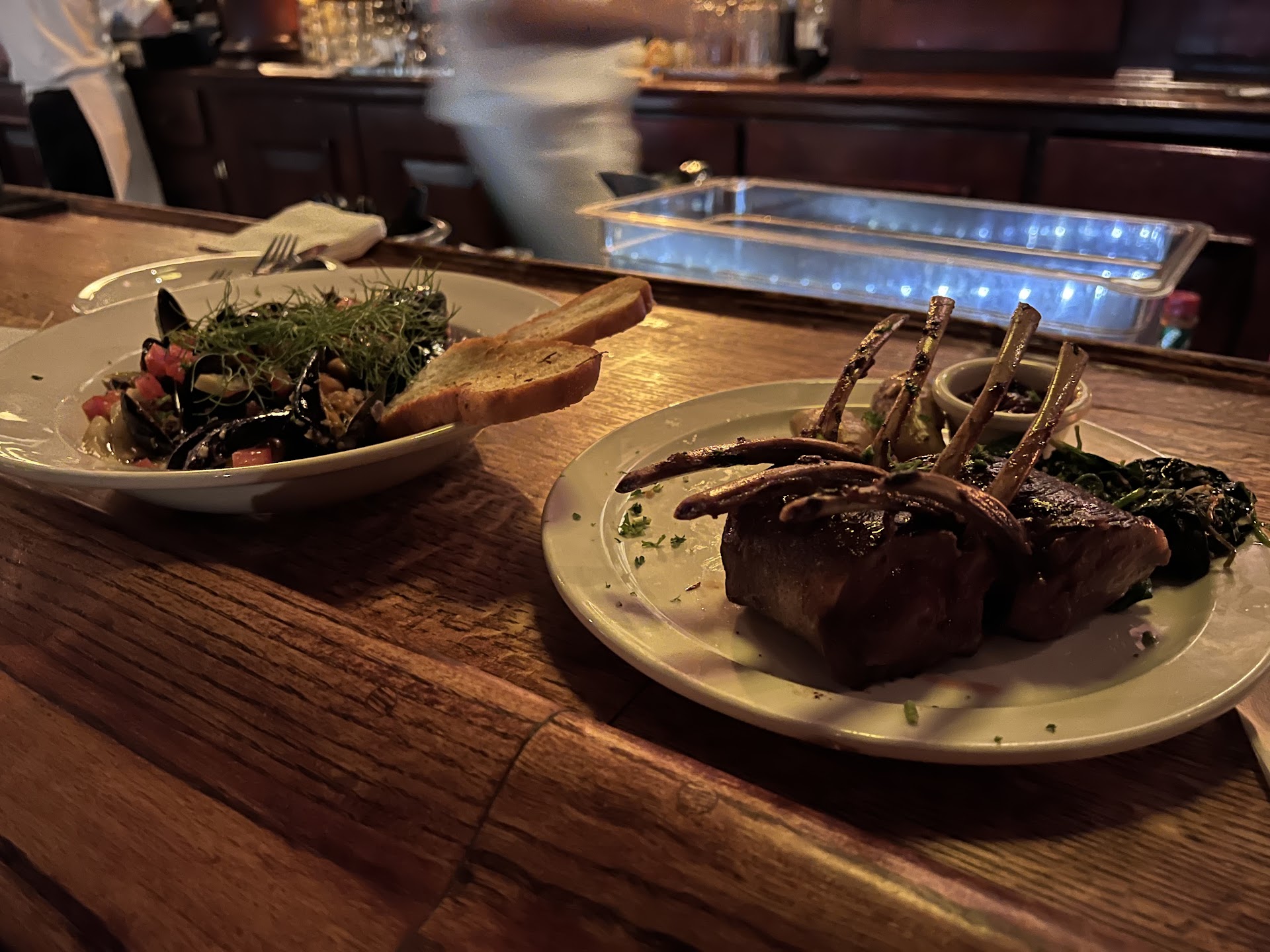 Now, onto the food. The calamari is fresh, flavorful, and paired perfectly with their spicy marinara sauce, which gives it the perfect kick. The rack of lamb is absolutely delicious, cooked to perfection, and accompanied by a side of greens and a sweet and savory cranberry wine sauce. My fiancĂ© was feeling adventurous and ordered the chefâs special: mussels with chorizo. I was blown away by the explosion of flavor in this dish! I never would have imagined that these two contrasting flavor profiles would combine so beautifully in such a perfectly balanced explosion of flavor.