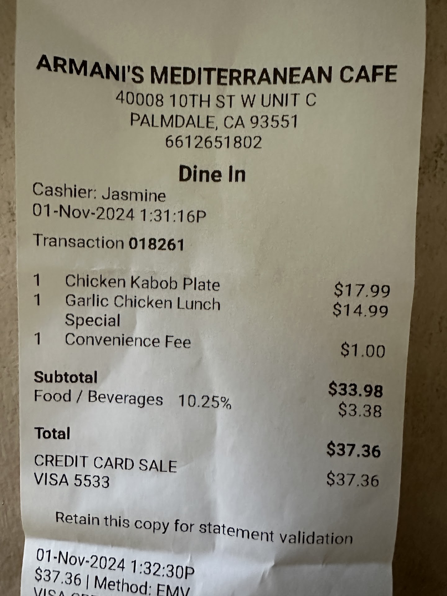 My spouse & I decided to try this place for lunch since it’s close to our gym. She ordered the chicken kebab & I ordered the garlic chicken lunch special. I asked for a cup for water. The bill came to $37.36 which included a $1 convenience fee. I guess that was for the cup of water that was brought to our table halfway through our meal.