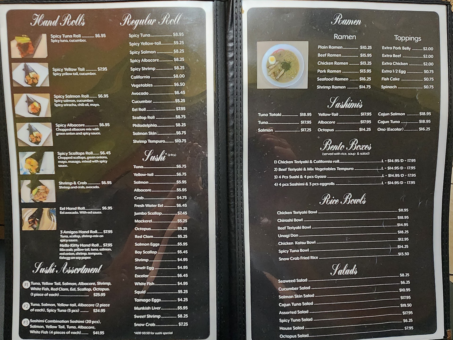 Food: The fresh and baked rolls we had were fantastic! Perfect sized rolls, fresh fish, crisp veggies, and outstanding flavors. The spicy garlic edamame comes with a sauce that is rich in flavor and spicy (I'd like to try it infused in a roll).