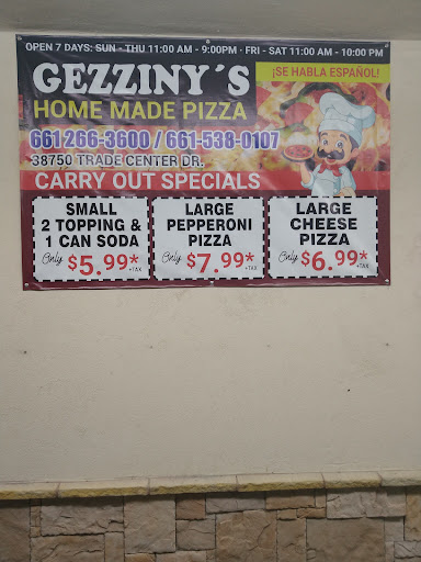 Read moreI just glanced at the low ball ratings for Gezinny's and the theme that jumped out is on line ordering is terrible. Here is my experience from today to validate those claims. This was my FIRST time ever using this pizza place. The website says they open at 0900 but they really don't open until 1100. No, I didn't want to eat at 0900 but i would have liked to order then and pick up at 1100 and not just start ordering at 1100. So I call and they answer at 1105. I literally was their first order of the day, maybe second so its not like they were maxed out. I want to order 7 XL pizzas, about $170. The kid on the phone literally sounded exasperated, like I'm bothering him. First thing hey says like he is trying to discourage me is "Ya know, its gonna be at least 40 minutes right?" That's what he said. Then when I said I wanted 7 pizzas , the guy like sighs and says "That will be more than an hour then" - Yeah he said that. So I was like "Sorry to bother you man, I'll take my business elsewhere." I hang up, I call Rigatonis in Quartz Hill. My order was taken in under 5 minutes on the phone. It took me 20 minutes to drive there , when I walk in, my last pizza is going in the box, they hand me all 7 I'm back to work in under 40 minutes. 15 very satisfied people here today due to Rigatoni's outstanding customer service. I wont be "bothering" Gezinny's with any future business. Terrible customer service at that...