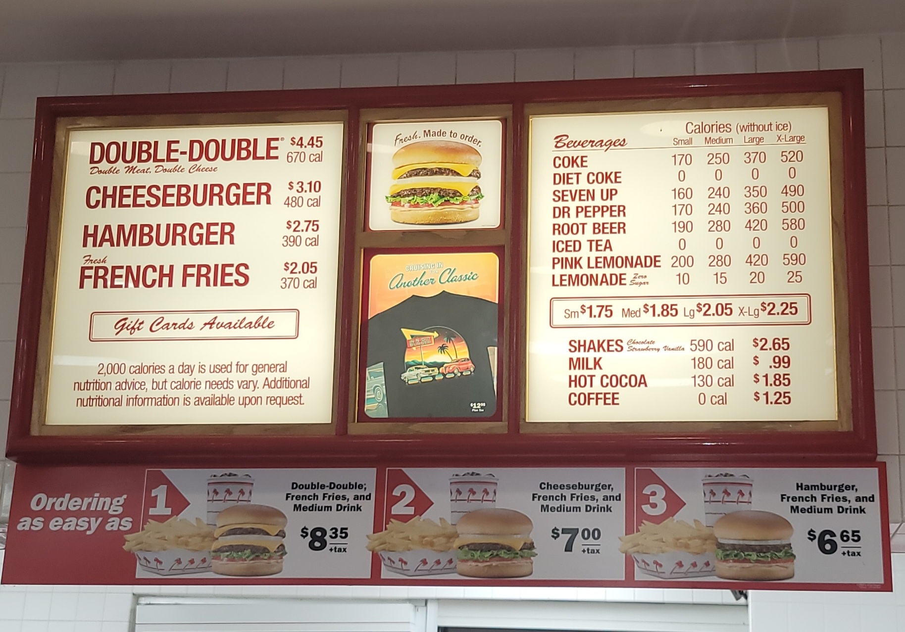 Read moreI've been out west for several months, but never had the time or courage to try any of the In-N-Out chain restaurants because the lines are always so long regardless of the time of day or city I'm in. Funny how eating at one of these joints was like an unspoken bucket list idea! I finally got the nerve to stop in Monday night (5/24/21) and order 2 double-doubles, 2 French fries, one medium strawberry shake (which wasn't that good), and one chocolate shake. Alot of good food for just $20.18. The drive-thru line was super long as usual, but only ONE person was inside at the counter ordering! Last night was my night, and when I walked in and saw the menu, it was so simple, I was shocked! I expected to see mushroom burgers, avocado bacon burgers, loaded fries, Yada Yada Yada! Nope, the menu was so simple (pic attached). Food so fresh, REAL, delicious, and simple but tasty. It didn't take very long (10-15 minutes) to get our food either. The food was also extremely affordable (receipt attached). The shakes really had no flavor. The food was haphazardly thrown into the bag, making us literally fish out our burgers (punctured our buns and got quite messy) from a ton of fresh crispy fries. I would definitely get no salt on our fries if we go again, which we likely will. Overall, good food, and I can see why people wait so long in these lines because the food is much better and cheaper than larger chains like McDs, BK, and others I try not to eat too often because those places have questionable "real" food. In-N-Out advertises real meat and potatoes and their food tastes undoubtedly authentic. Yes to...
