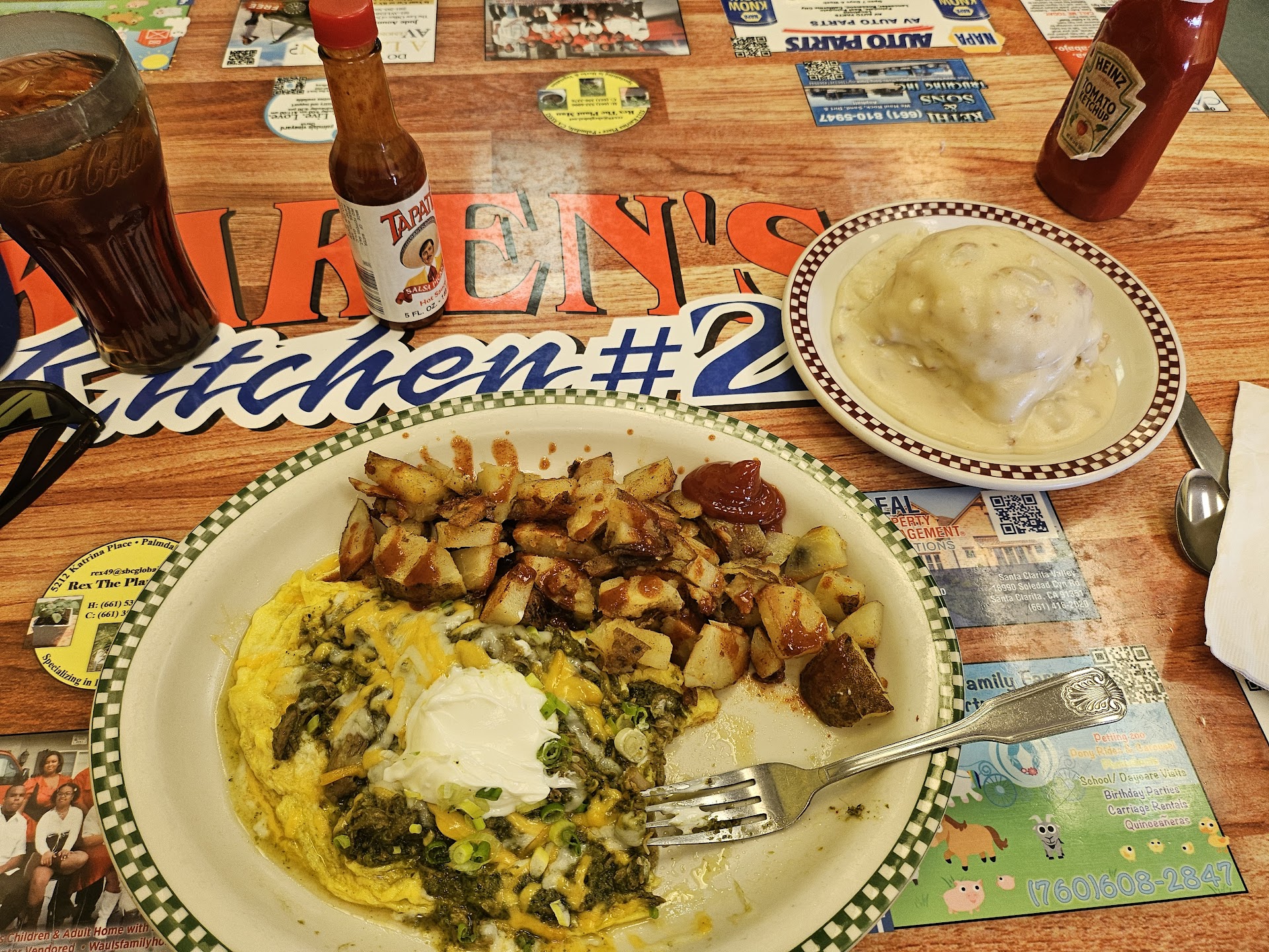 I had the Chile Verde omelet. I got it with home fries and a biscuit covered in gravy. There were no upcharges and no extra add-ons. This could have fed me for 3 days, but it only cost 15 dollars. I rolled through this sleep spot at 730 in the morning because I couldn't check into my hotel room at such an early time and I needed to kill some time. Let me tell you, it was a lovely time watching the different patrons walk through the 1980s, stuck in time, door and enjoy themselves. The building is old and the walls tell stories of the past, but the country decor hides it well, and the food eclipses any locations related negative remarks I may have.