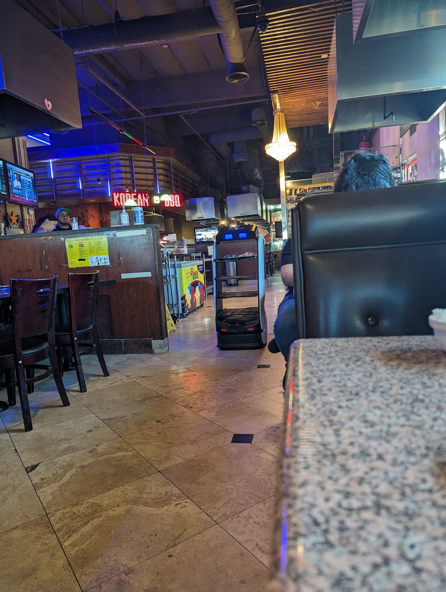 First time here. Loved the idea of cooking or own meats. At first our server (a White lady) was very nice & friendly & we even asked for help on how to use chopsticks. I thought we would have a great experience. I was wrong. I was going to ask for salt & pepper to add flavor to our meats which were not preseosoned but I never got the chance....She, our server must have forgotten about us. She had said she brought small servings (& they were) to make sure we liked them... Then she would bring us more of what ever we liked...(it's supposed to be all you can eat)... Again we never got the chance... she never came back. We sat there for over 15 minutes waiting with empty drinks & empty meat trays. I can point out our neighbor table was having a completely different experience. The Hispanic man serving them was treating them like royalty... plenty of meats & drinks refills & constant attention. He even changed out their center table grilling dome. I would say that server was great but he really wasn't. I could hear them speaking Spanish & since I also speak it, I could understand them. It was obvious they knew each other. I tried to get his attention once but he was too busy being extra friendly & catching up with them to notice or care about anyone else. I had lost my appetite & was now on the verge of being angry & just wanted to leave. There is no front register counter. I could have just walked out & no one would have noticed. I had to find someone to pay my bill. I flagged down a worker. He was an Asian (Korean?) young man. He said you usually pay your server. I told him I was frustrated & felt we had been abandoned & just wanted to pay my bill & leave. He took my payment but then lied to my face... saying he had been walking around in our area to see if anyone needed anything. He had never come near our table at all. Very disappointed. I should have walked out without paying but I just couldn't do that. Sadly I will...