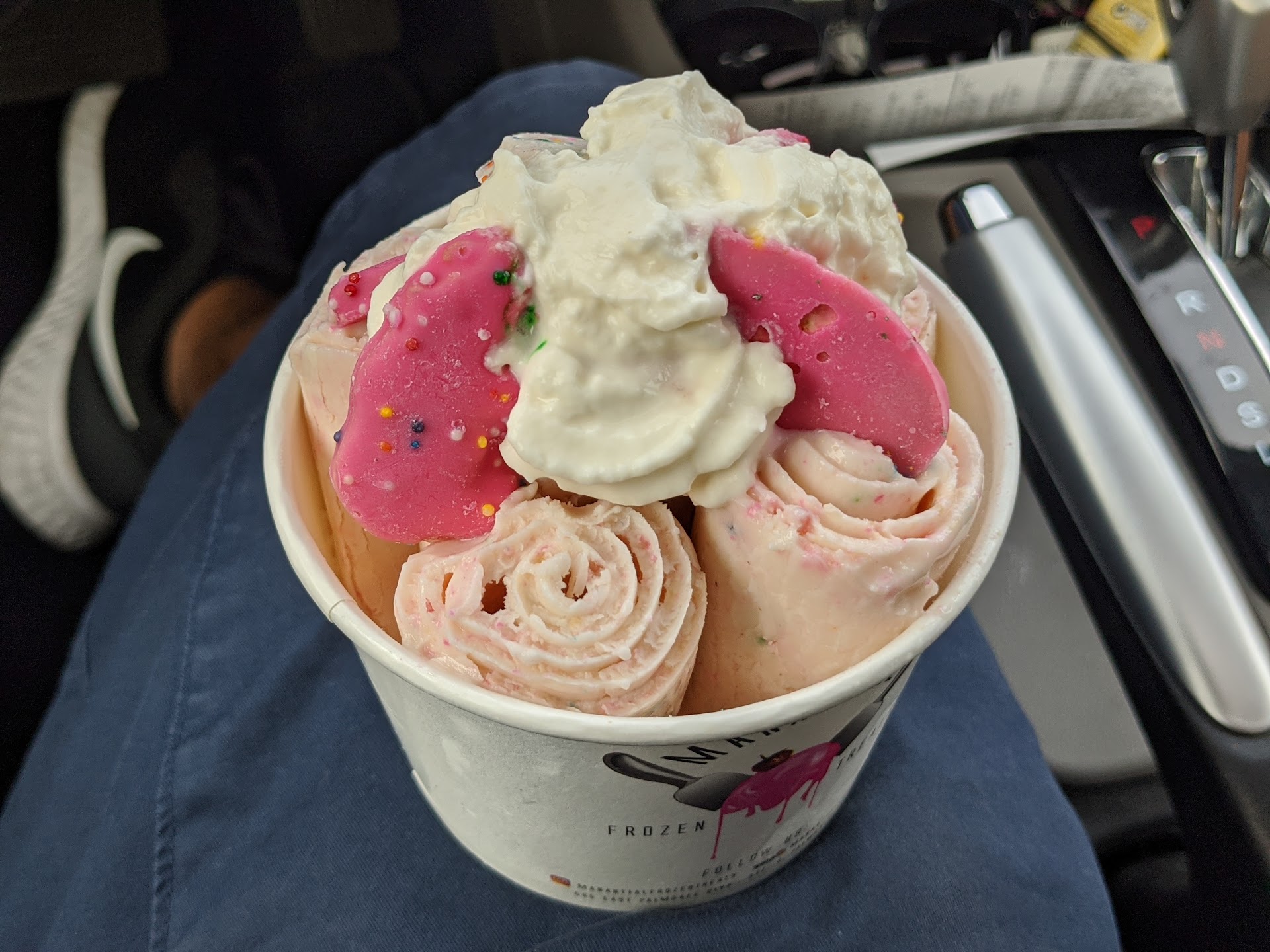 We took it home, which was about 10 min away and none of it melted! I was surprised cause it was hot. Everything we ordered was SO tasty! I got the donut roll and would absolutely get it again. I mean who doesnāt want a donut on top of their ice cream? Genius!! Their servings are massive. So much so that I could only eat 2 rolls and put the rest in the freezer....