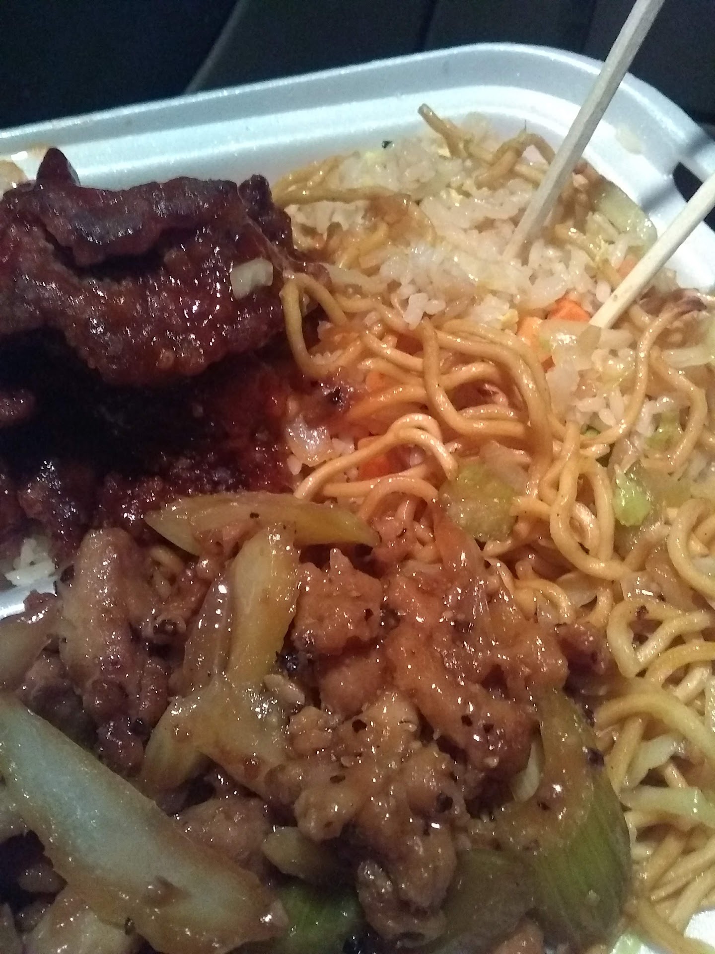 There were five if us,and we decided to eat here and we were pleased with the food.We all got 2 choices with our rice or chow mein noodles.The dishes were warm and seemed fairly fresh for the most part.Some of us got vegetable spring rolls as there are also chicken spring rolls and another got fried shrimp.I got kung pao chicken and honey walnut glazed shrimp with my chow mein.The kung pao was not over the top spicey and the honey walnut shrimp were good and I liked the texture of both dishes.The sweet and sour sauce was hot and flavorful and went well with everything.The staff was personable and polite during our order process.The only reason I am giving this place a 4,is because I had to wipe crumbs off the table myself which were visible from the counter where we were ordering our food which was like ten feet away so they weren't small crumbs,and we all know that can be a bit...