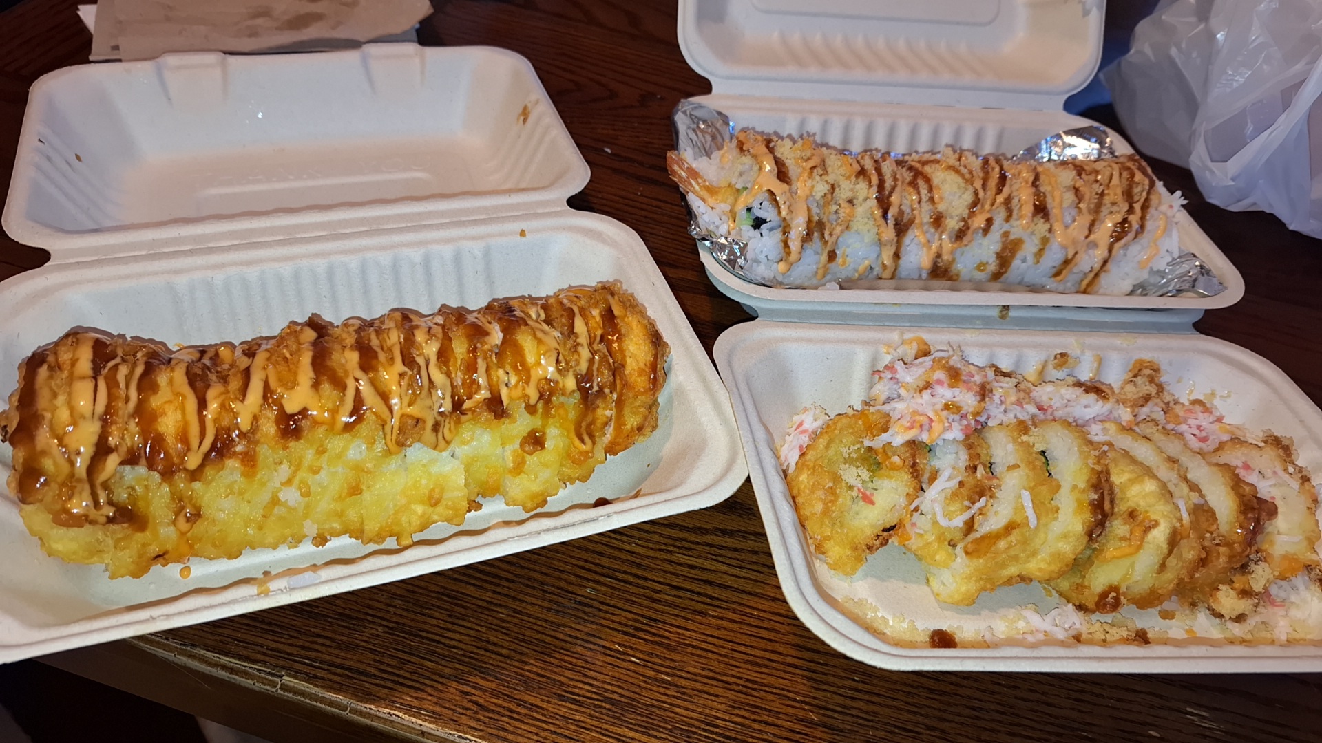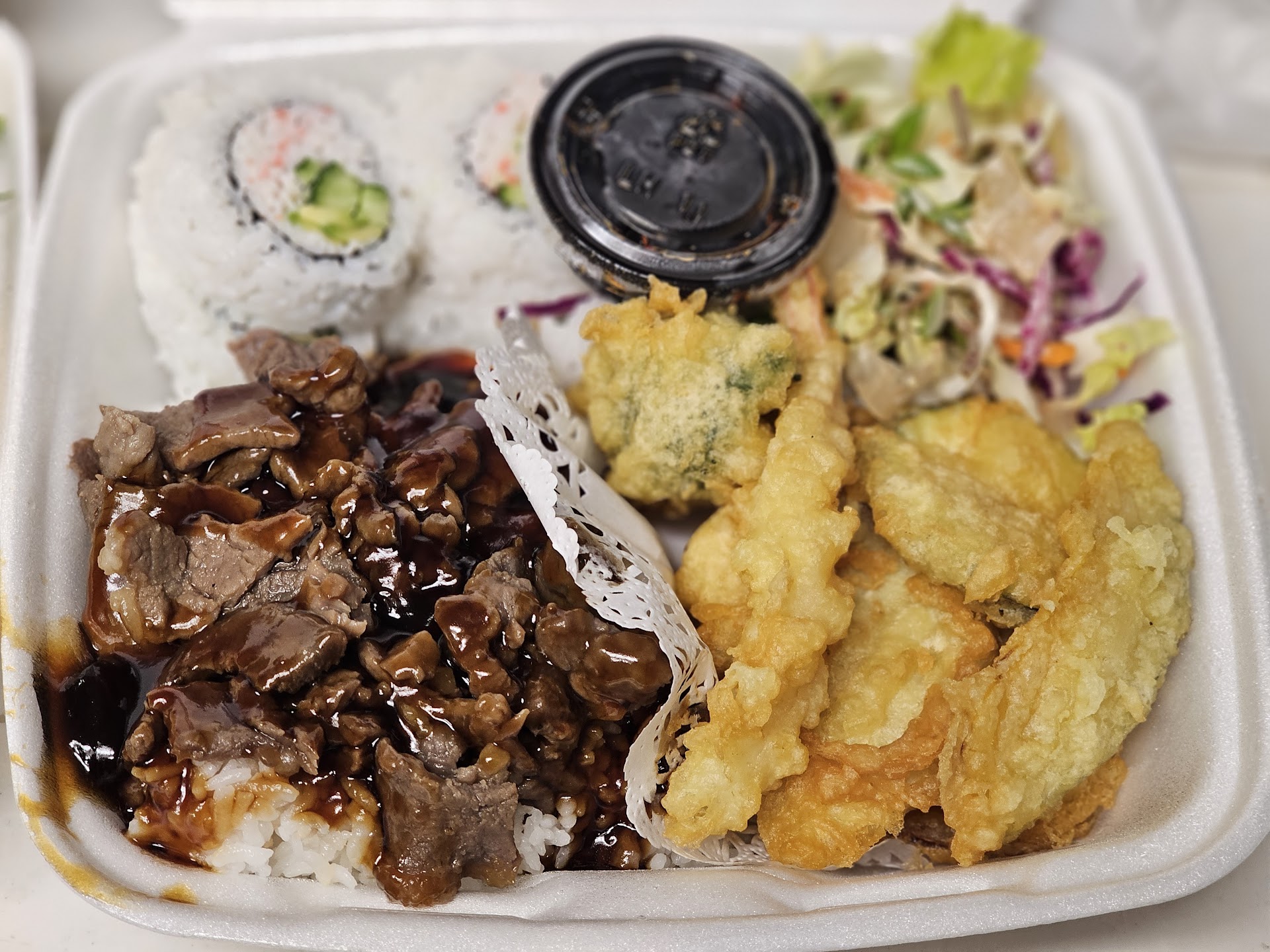 Read moreWe stopped because the hamburgers looked good in the window. Went in and didn't see them in the menu but all the sushi looked so good. So we got a chicken plate which was great! Got 2 rolls and they were huge!!!. It was a bit small and warm in dining area. Staff was friendly. The guy gave our food to other customers who were waiting after us, then they returned it and he bagged food to go in front of us, when we were dining in and gave it to us..which was why I didnt give them 5 stars. Will definitely go again, like I mentioned the food was great but will be taking to go...