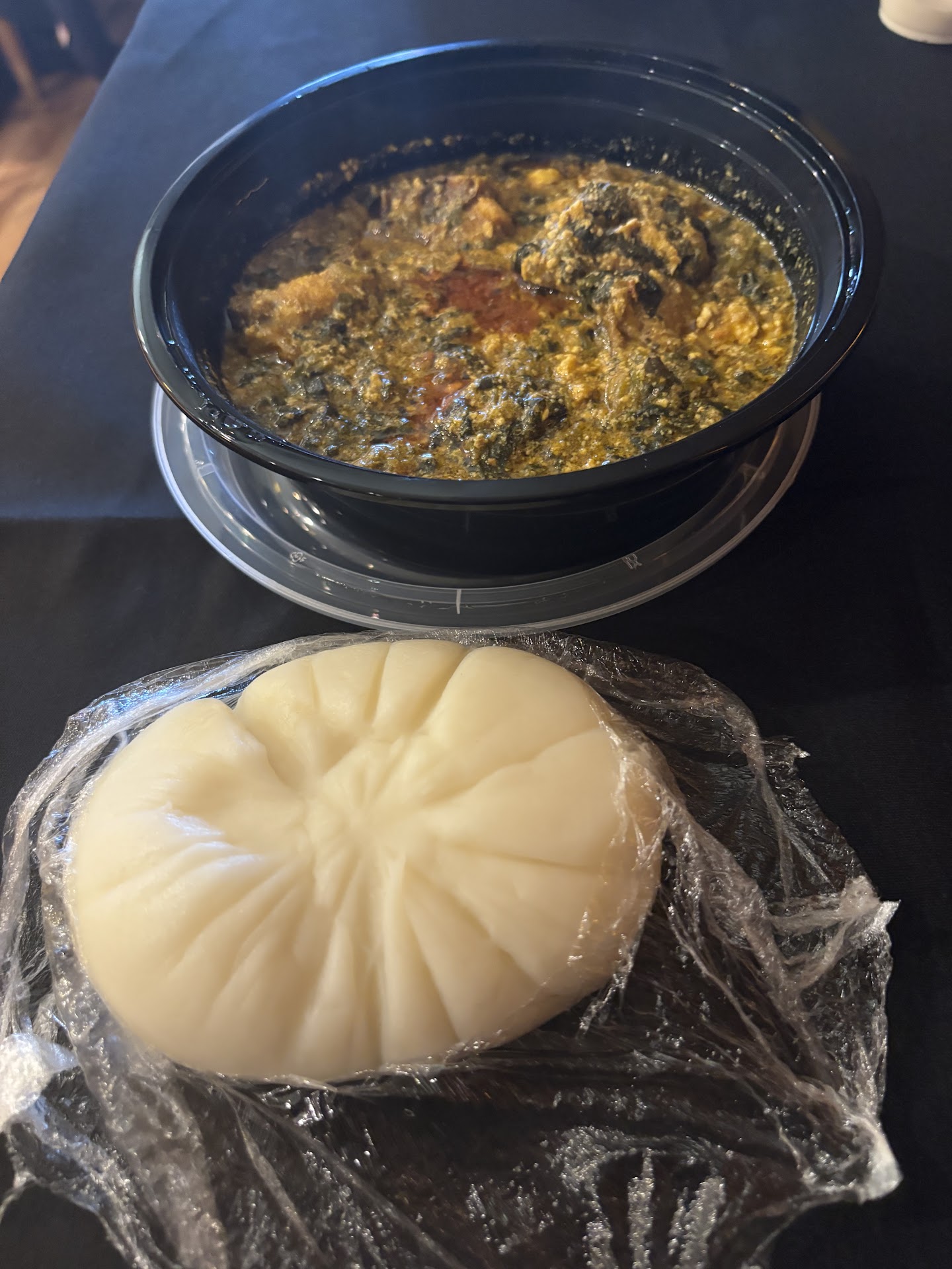 Pros: the staff was very friendly, I enjoyed the look of the decorations & the music was very enjoyable ! The fufu was a cool experience & tasted fine (not much of a taste of course as it’s like mashed potatoes just thicker but a great vessel for other food.) It came out very quickly- maybe in about 15 minutes or so which was nice.
