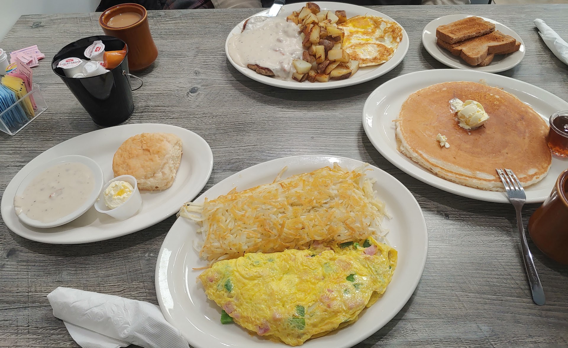 I’ve been here three times, they say three times a charm and honestly i only come here because my son likes their breakfast. I admit they give good portion size for your money. But all three times I wasn’t too impressed with the taste of the food. First time was chilaquiles and that was no way authentic tasty at all. Wasn’t thrilled with it. Second was breakfast omelette with hash browns, which the hash browns could have been cooked a little longer, only top part was browned the rest raw potatoes… and the last time I ate there had country fried steak and biscuits & gravy. If you like gravy then you’re in for a treat, because they drowned both the fried steak and biscuit so all you see is that gravy!