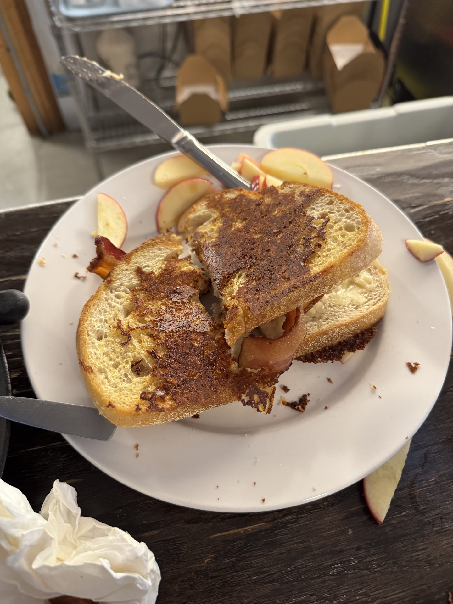 We ordered three dishes: a honey hot apple bacon grilled cheese, eggs Benedict, and a BLT with eggs. The grilled cheese was a bizarre letdown—expecting apple-flavored bacon, we found actual apple slices mixed in, which didn’t work at all. It was dry, with shredded cheese sprinkled on the bread, making it one of the worst grilled cheeses I’ve ever had. The BLT was equally bland, lacking flavor, salt, pepper, or butter—just plain and dry. We took one bite of each and couldn’t continue. The eggs Benedict, thankfully, was solid, and we finished it.