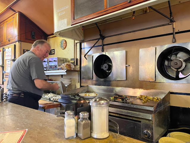 Read moreThe main reasons to visit this place are the intact historical nature of the place and Carl, the cheerful and funny cook. If you want great diner breakfast food with a little entertainment on the side, this is your place. The breakfast food here is the best in town. But there is a downside and it can be painful. The wait for your food here can be excruciatingly long. Carl only cooks one or two meals at a time, so you have to wait... and wait... and wait. Even worse, for some reason, takeout orders seem to take priority over in-restaurant orders. Others have noted the same odd thing. Your in-restaurant order will get pushed back while they do takeout orders if any happen to come in. So bottom line: Try to hit the place when it isn't too crowded and make sure you have plenty of time. The food and the show...