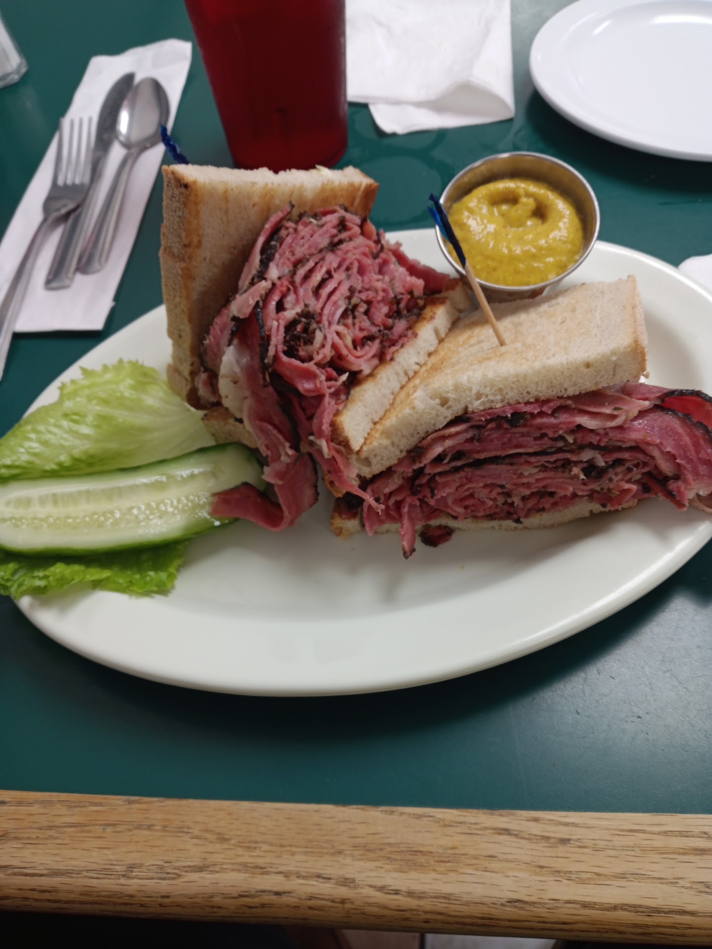 Read moreI have worked in a New York Jewish Deli for over10 years so I do know about Pastrami and Corned Beef Sandwiches. Your "Hot" Pastrami or Corned beef sandwiches cost $16.99 each. We ordered one of each with fries and drinks. What we got for $16.99 was appalling. Each sandwich was just a round ball of sliced meat between 2 slices of bread. Meat was barely warm and there was so much exposed bread. We had to take the ball of meat apart and make each sandwich more presentable. The rye bread didn't hold up to well while eating the sandwiches. Your fingers just went right threw the bread while eating it falling apart as you ate. There was no presentation to the food you serve. For $16.99 each there should've been a much nicer presentation to the sandwiches other than a ball of meat and 2 slices of bread. A sandwich should be made to be presentable and "HOT". You need to build a sandwich rather than flopping a ball of meat on bread for $16.99. The waitress didn't bring our included Cole Slaw, I had to ask the bus boy for it. The waitress was horrible and barely spoke english. .Why does the waitress hover over you when paying on the portable payer. Is she making sure she's tipped. We will not return...
