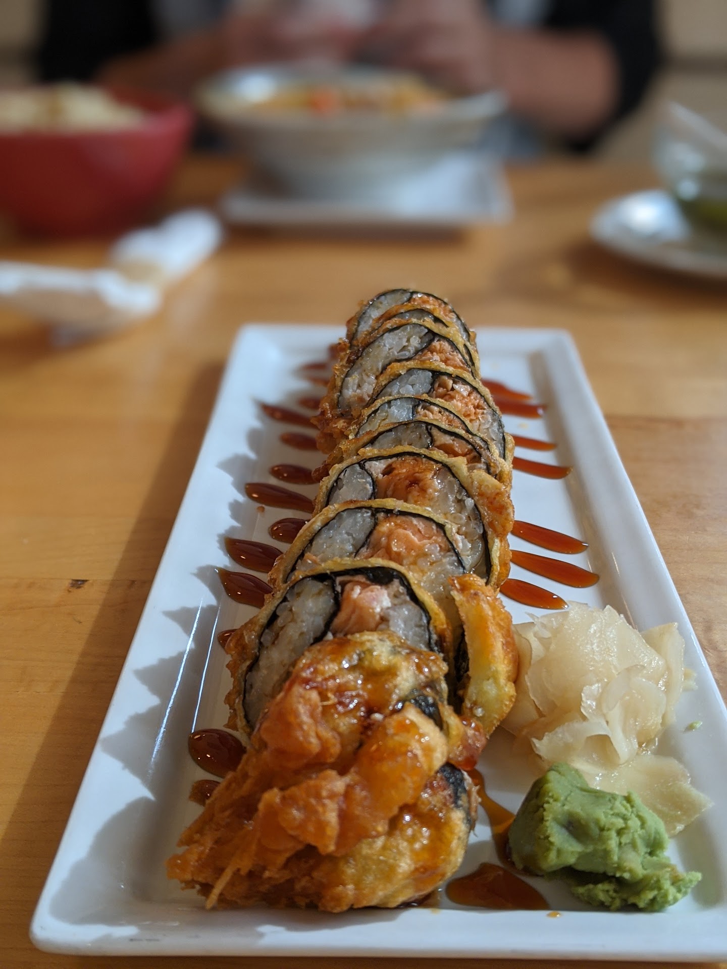 I ordered an appetiser of tempura shrimp. The roll came out before the appetiser! It looked very unappealing because it was drenched in that spicy mayo sauce. I literally had to scrape the mayo off the roll, I also had to try wipe it off with the napkin, which the waitress saw me doing and she didn’t even try to do something about it. It was so much mayo that while trying to wipe the mayo sauce off it slipped out and fell on the floor. When the waitress finally came over to see if everything was ok, I told her it was so much mayo sauce on the roll making it very slippery it fell on the floor. She said well next time we can order ‘light’ mayo!!! Really!?! Next time ?!? I think whoever made that roll doesn’t understand the concept of sushi and just wanted to make the sushi like an American sub with a bunch of mayonaise.