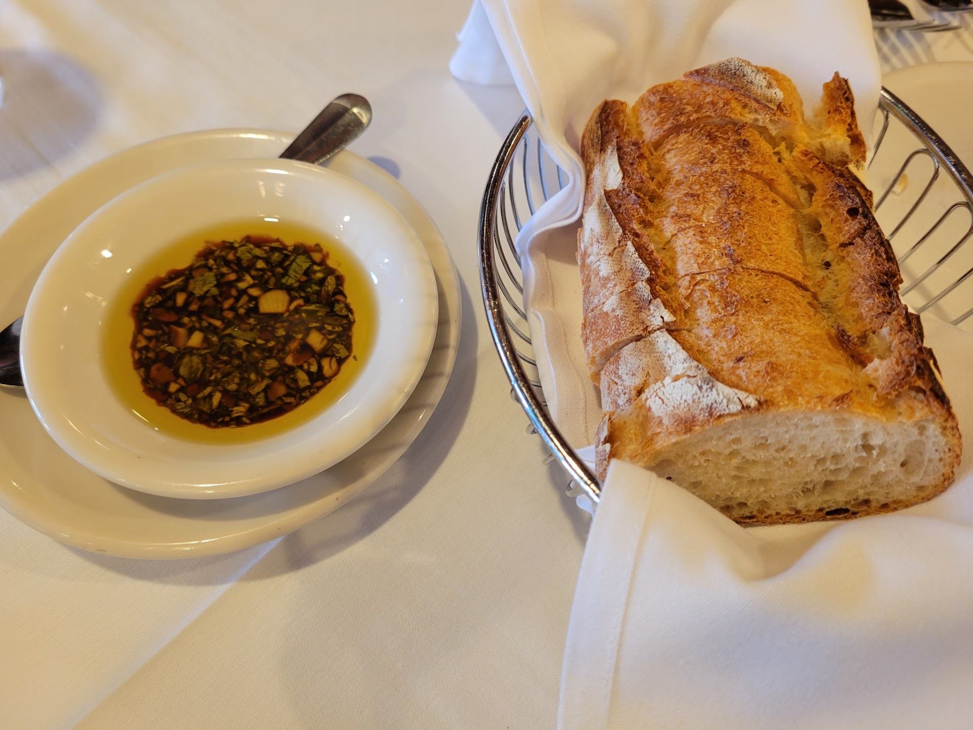 Not impressed with how the meal started off, we perused the menu. It was a limited menu for Christmas but we all managed to find something we were interested in. The server started to bring us bread and drinks, though it was incredibly awkward for her to serve us given our seating arrangement, something that plagued the table for the rest of the evening. We ordered a bottle of wine, a 2014 Pinot. The wine that was brought was not the 2014 Pinot, but the 2015. We were told that this was all they had, but that it would be equally good. The bottle was perfectly mediocre, nothing to write home about, and definitely not worth the price quoted for the 2014 ($62). We weren't sure what we'd end up being charged, though we assumed surely less.