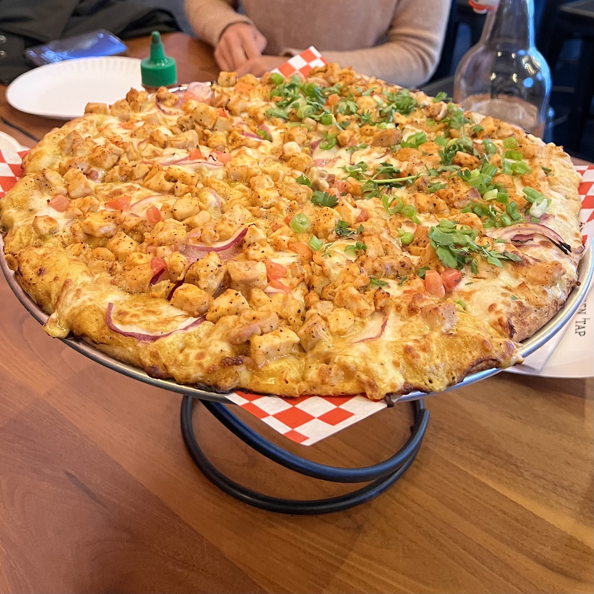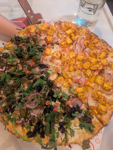 Pizza was OK but nothing out of the ordinary. I was expecting some interesting Indian flavors but pretty bland Curry Chicken Masala that I spiced up with the crushed red pepper at the table. That pepper on the table should have been my clue. I have never been in an Indian restaurant where additional hot spices were at the table. When ordering I asked for the pizza to be extra spicy and the waitperson said that Jalapenos could be added if I wanted.???? Any pizza place I have ever been can add Jalapenos!