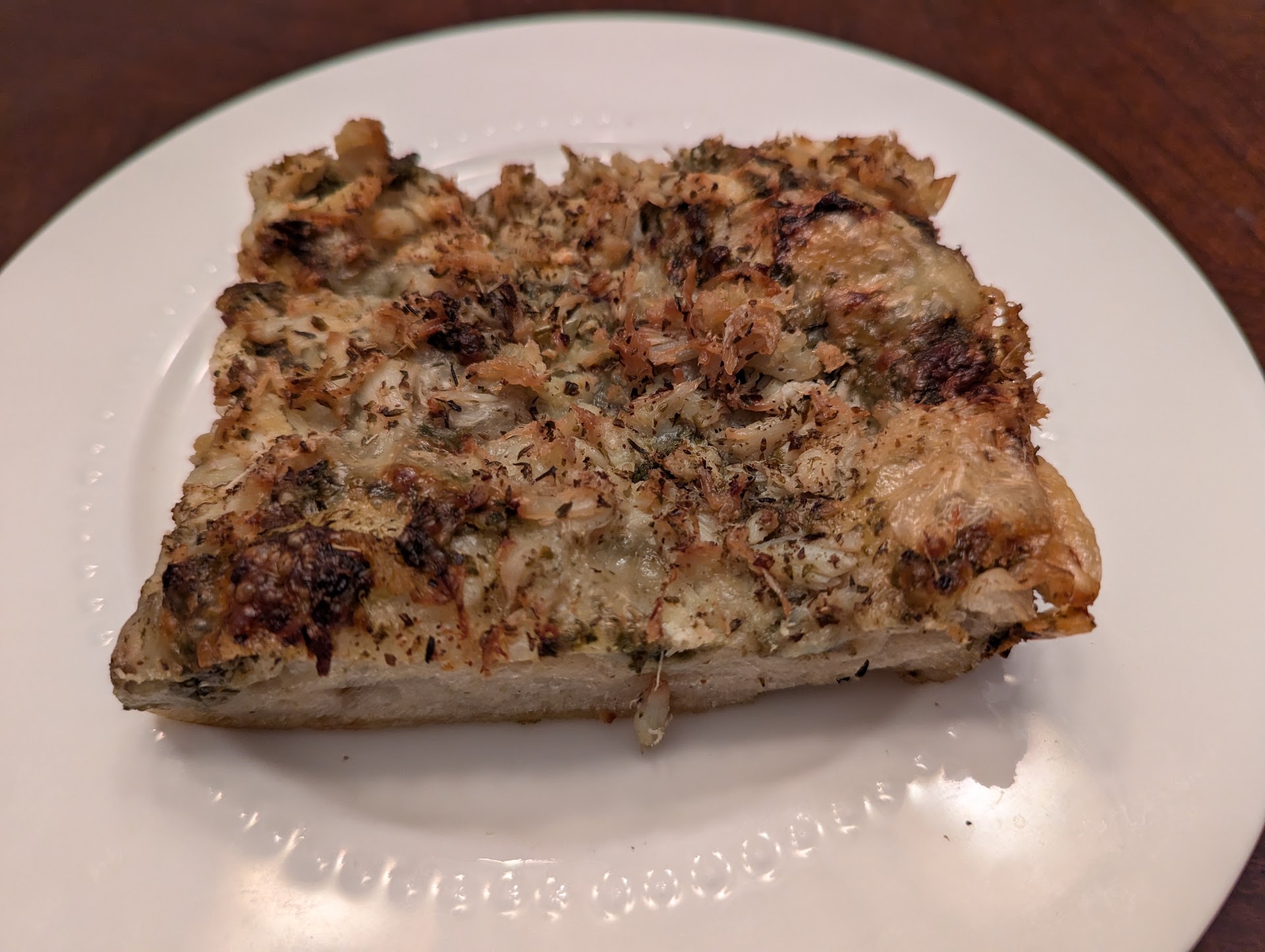 The first bite proved that cherishing the delicate texture of this bread really paid off - one should treat it like a tuna fillet, browning outside while keeping the pinkish inside. Over-cooking will surely ruin it. The bread is crispy outside, but soft/chewy inside, a marvelous combination that reminded me the pandan waffle I had in Oakland. Olive is interesting - it gracefully balanced the plain feeling by adding a hint of bitterness, saltiness, and sweet after-taste. Parmesan is very light, does not overpower the olive. The smell is wonderful, but very hard to explain - just imagine breathing in the fresh air when sitting under the tree in the morning. A sliver of sunshine passing through leaves and landing on the face - that kind of feeling.