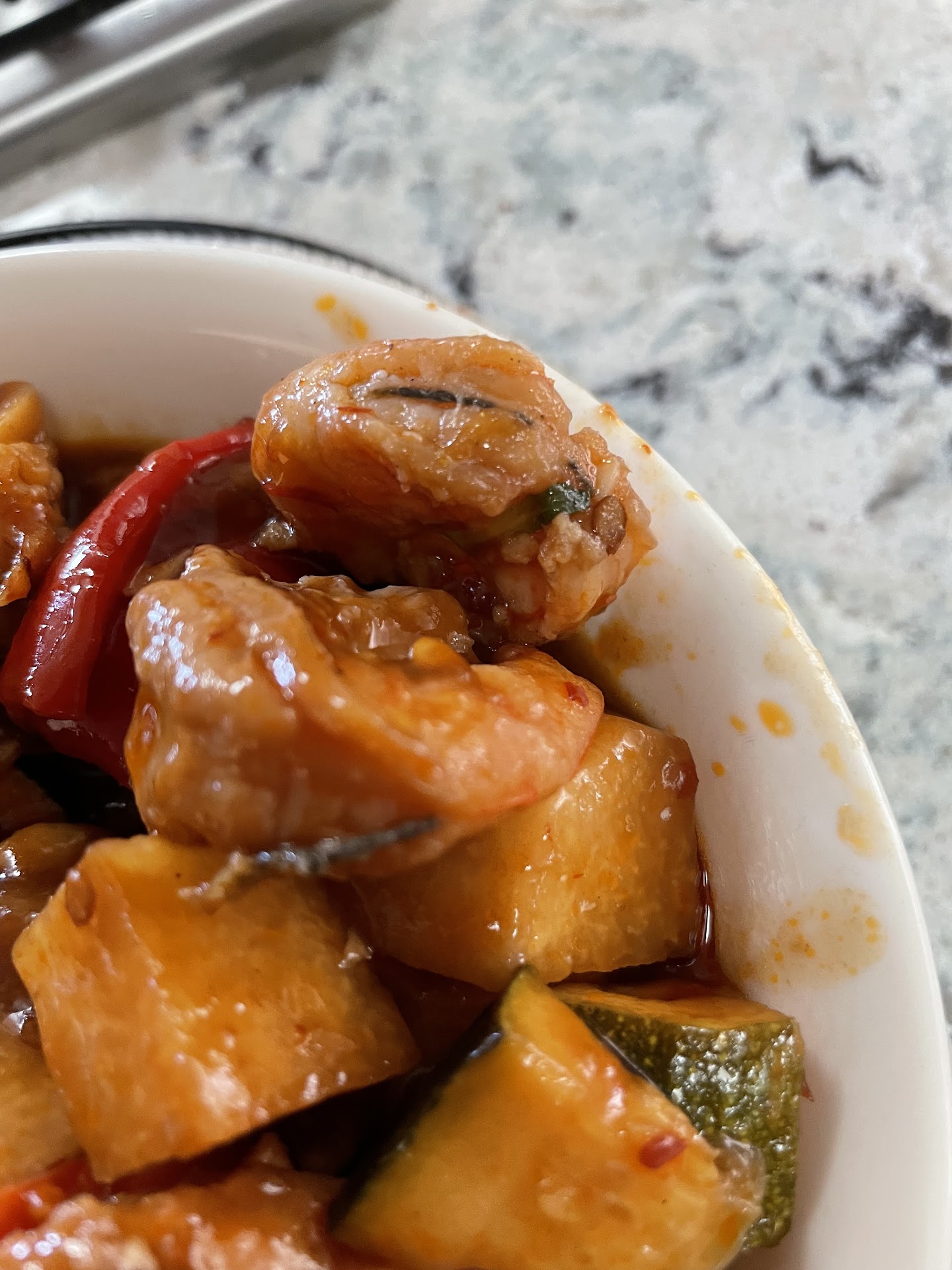 The food is very delicious. The mango salad was exceptional, especially due to the peanut "dressing". The appetizer sampler consists of fried food, which we did not realize when ordering. It was nevertheless very delicious. A specialty that comes with the appetizers are the dipping sauces. They say one is spicy but it's actually not that spicy and very flavorful instead. It's more the kind of Wasabi spicy. The sweet sauce was good, too. We had chicken with broccoli and rice. It tasted very good. The veggis where just steamed right and in contrast to other places there was not too much oil or salt used.
