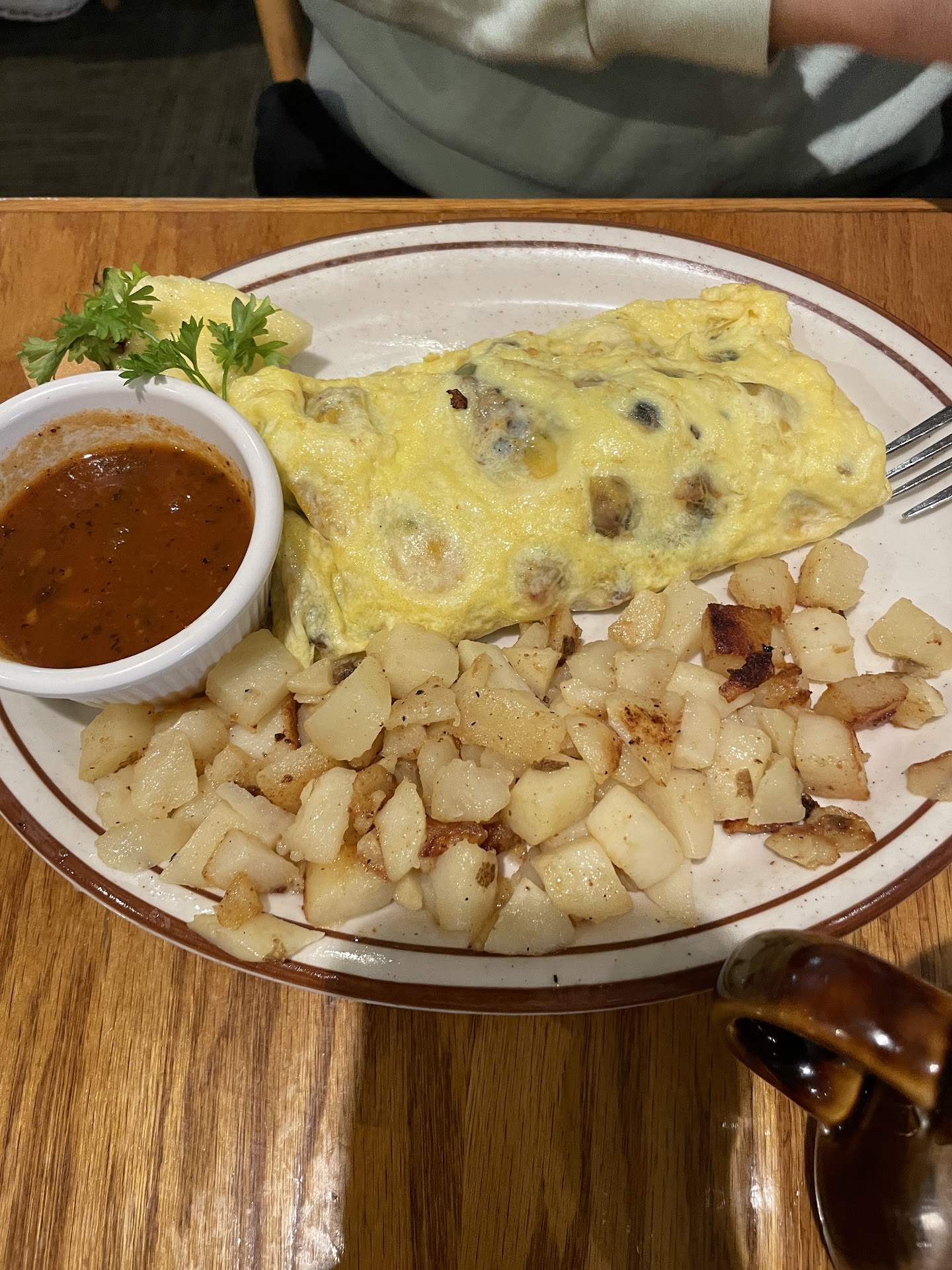Read moreMy husband and I stopped by for breakfast. I was very excited to try this place. It started off fine, quick service for getting our morning coffee. The waiter was quick to help at the beginning. I ordered Bennie. There was confusion on the menu. Husband wanted to know want came in the breakfast bowl decided to go with an omelette, waiter made some suggestions,all was going great. I ordered a Bennie which I thought came with pancakes and a choice of coffee cake or hash browns. Order came no pancakes, hash browns were actually country potatoes (which I don't like), and my husband omelette was okay. All in all we were unimpressed but it happens felt like we spending more money than what the breakfast was worth, didn't really like the food, but that's on us. If that's all that happened we would have shrugged and said nothing. Sometimes you just don't fit with a place. Waiter came by and asked us how our food was we said that it wasn't for us, but eh it happens. NEVER saw our waiter again. 15-20 mins later had to go to the front and ask for a check. Just because we didn't like the food didn't mean we weren't going to treat the wait staff well with a tip. We were overall impressed with the staff to start, but to be written off and abandoned. I hope the staff learns that sometimes people don't like the food but will still be respectful to the workers. Bust boy was super kind and helpful after the waiter just...