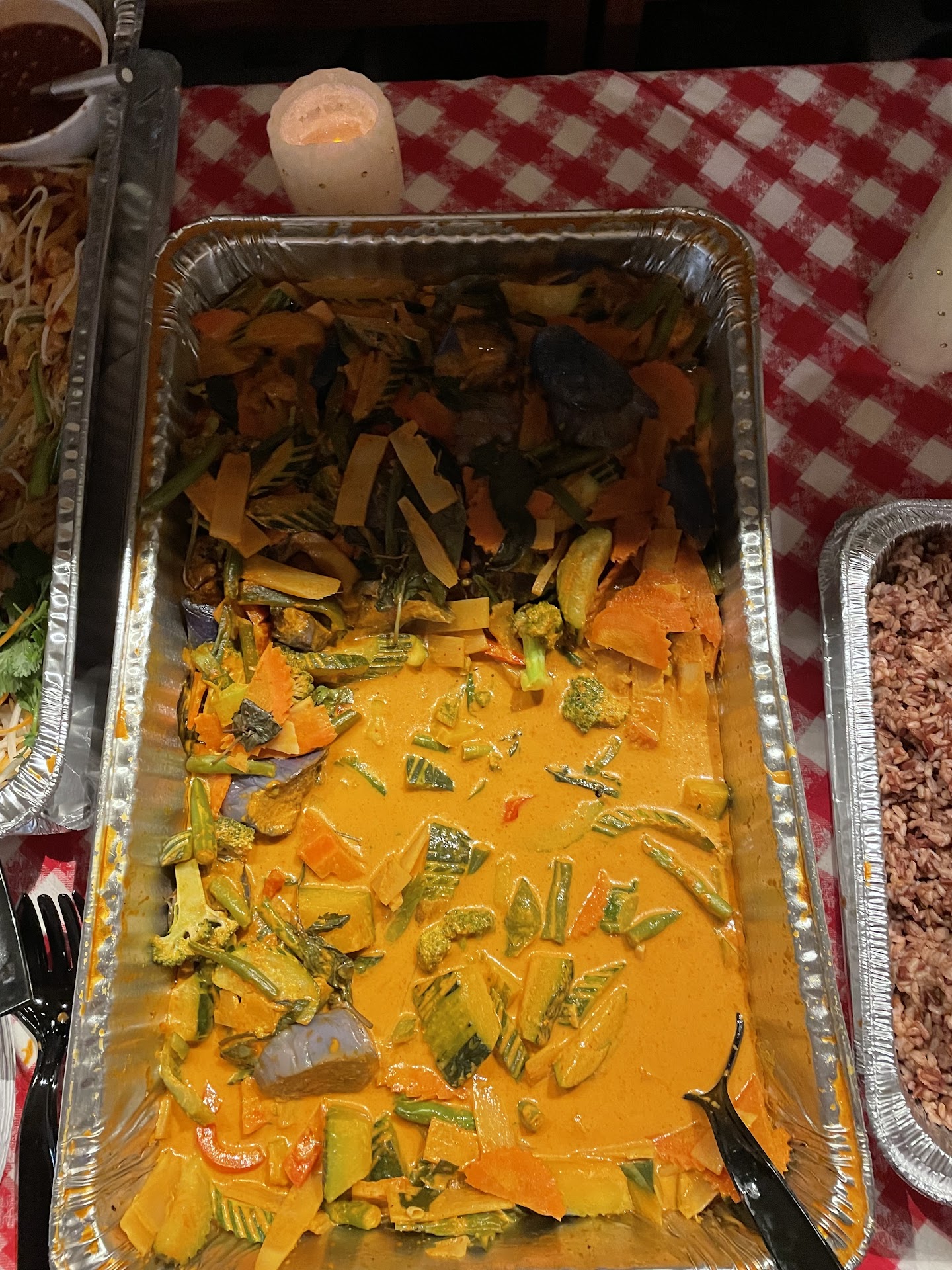 The order: chicken pad Thai (peanuts on the side!), fresh rolls (vegetarian with an amazing sauce!), pumpkin curry, brown rice, samosa.