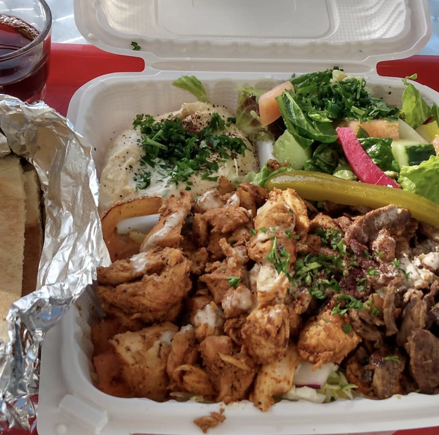 Decided to have the hummus wrap. Order came within a few minutes. Came with a complimentary falafel. The wrap itself was of pretty decent size and plenty flavorful. Comes with option of hot sauce for all you spice heads out there. Was given a pleasant tea as well. Incredibly pleasing.