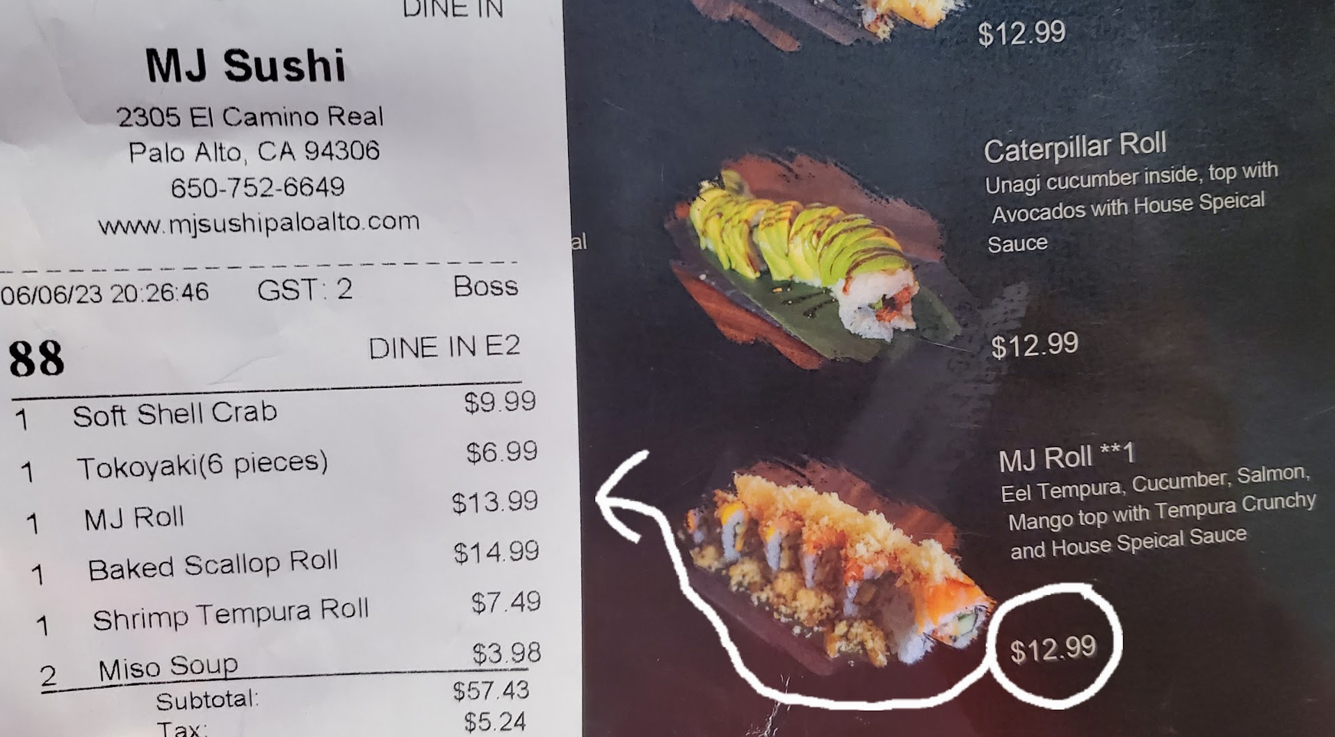 The worse thing was the prices. I asked the waitress why the orders have different prices from the receipt to the menu and she said, it just happened today. I just let it go, all I wanted was to know the reason. For the establishment to not notify you of the price change before the food gets to your table is, I feel like something illegal and very unprofessional. Check the photos I...