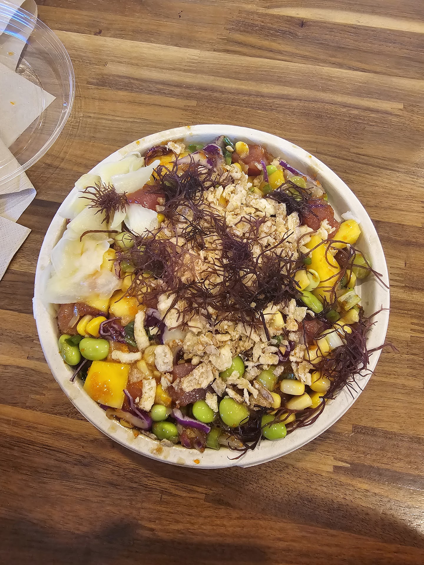 Poke house is the chipotle of poke bowl, which means you make your own poke bowl by picking and choosing all the ingredients. It is located in a strip mall, and parking can be somewhat tricky. Some parking spots are 20-30 minute parking spots, so please pay attention to the signs. otherwise, you will get a parking ticket if you overstay your parking. They have 3 different bowl options- small, medium, and large. My friend and I, we both got the small bowl and found it very filling. You basically pick 5 different things for your bowl- 1. Base 2. Protein 3. Mix-ins 4. Toppings 5. Sauce Each bowl also comes with a free scoop of crab salad so don't forget to try that out. For base, you can pick between sushi rice, spring mixed greens, zucchini noodles, or brown rice. Under proteins, you have 8 different options - ahi tuna, scottish salmon, spicy tuna, octopus, shrimp, tofu, and spicy miso salmon. You can pick multiple sauces for your poke bowl. You have multiple sauce options- house shoyu, lime ponzu, miso aioli, sweet unagi, sriracha aioli, garlic soy vinaigrette, and house chili. For mix-ins, you have corn, cucumber, edamame, green onions, grape tomato, hijiki seaweed, jalapaneo, mango, masago, pineapple, purple cabbage and sweet onion. You can add multiple mix-ins to your bowl. There is no limit. And lastly for your toppings, you've got crispy onion, furikake, nori strips, ogo seaweed, pickled ginger, seasame seeds, sliced almonds, togarashi, wasabi, avocado (+$2.50) and seaweed salad (+$2.00).