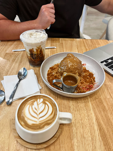 We came inside this beautiful establishment. We ordered a mango peach refresher which was the most refreshing sweet tasting drink I have ever had!! It is a sweet mango flavor followed by a peach flavor that makes the drink even more pleasant. We ordered a cookie skillet, and since the wait time would be prolonged the staff people apologized and refunded us our money as well as gave us three desserts on the house! The staff are the most hospitable and kind. This place will not disappoint you! The beautiful interior and large windows for natural sunlight gives it a beautiful ambiance and classy feel. The tres leches cake was so light and airy with a beautiful sweetness that balanced the dessert. The ova pecan roll was so silky and creamy with a beautiful biscoff crumble and white chocolate filling topped with pecans. The dessert is life changing being soft and warm with a beautiful flavor. The Dubai cake is a chocolate cake filled with crunchy rich khanafeh filling which is not to sweet, this balances the moist soft chocolate cake and the decadent chocolate sauce that is draped over the cake which adds a richness to the dessert. It is Dubai chocolate leveled up by x100. The price range is not extreme and the quantity that your are getting for the price makes the pricing justifiable as well as the great customer service. From the three deserts if you are feeling a light treat the tres leeches will not disappoint, for my Dubai chocolate lovers/ chocolate lovers the Dubai cake will be your best friend, and for my cinnamon roll and biscoff lovers the ova pecan roll will take you on a journey of flavor that will transcend any cinnamon roll you have ever had! If you want to come to a cafe that feels like home, this place is for you. If this post hasnât persuaded you to go, then what are you doing with your life! Go and submerse yourself in a realm of elegance and...