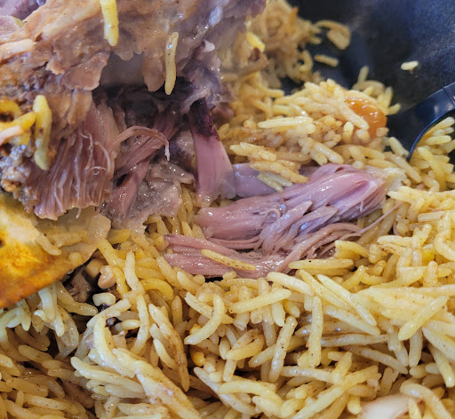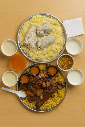 The platters are massive, designed for sharing, and showcase classic Middle Eastern hospitality. Fluffy basmati rice is paired with tender, slow-cooked meats that fall off the bone, rich with spices and flavor. The creamy sauces add depth, while the fresh salad and tangy dips balance everything perfectly.