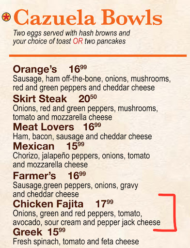 Read moreI really loved this place, but on my 3rd visit today I had the unfortunate experience that has completely altered my view and broken my trust. I ordered the Chicken Fajita Cazuela Bowl (Onions, green and red peppers, tomato, avocado, sour cream and pepper jack cheese). I specifically mentioned my mushroom allergy, as many of the items on the menu come with mushrooms - just as a precaution. I received my food, ate a small top layer portion (egg, avocado, chicken and cheese) and took the rest home. As I ate more of the leftovers later today I started having a reaction to the mushrooms that were mixed in with the hash browns, onions, peppers & tomatoes in the bottom portion of the bowel. I am lucky to have caught it early enough & have my EpiPen on hand. I was just looking to have a nice breakfast after just being released from the hospital yesterday due to complications from my high risk pregnancy and I really hope I do not have to return because of the lack of attention to detail on behalf of Orange's...