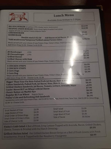 I have been to Finley's a few times and always impressed with them. The servers are always very friendly and welcoming. Unfortunately, I cannot remember the name of the server that waited on me the last time I was there, but she was excellent!! She was very friendly and eager to help. But the most impressive thing about her was that she overheard a little of mine and my friend's conversation about a problem and she offered some really great advise. My friend and I are both in our late 60's and this lady may not have even been 20, so I was greatly impressed with how perceptive she was. Anyway I would recommend...