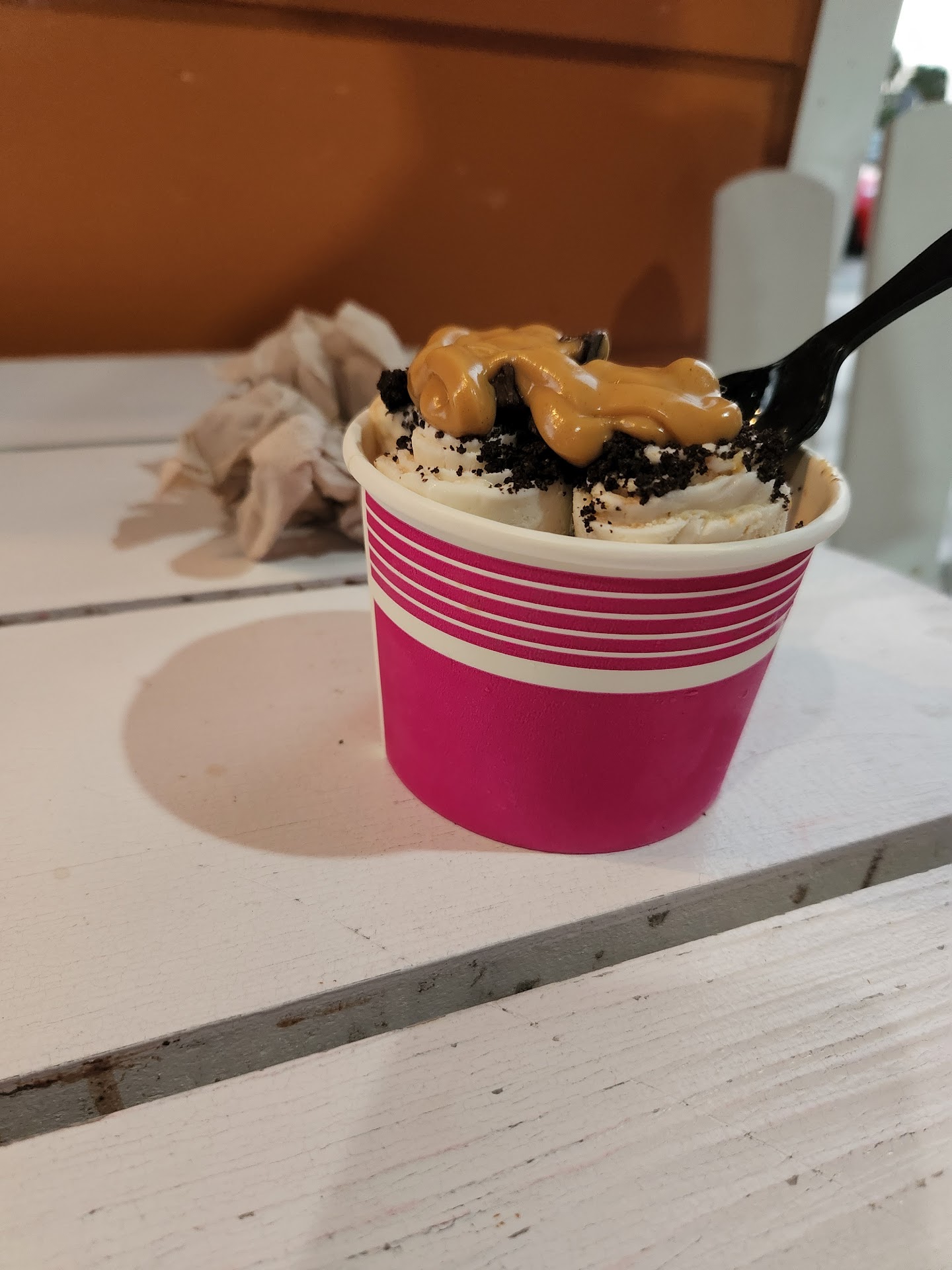 Read moreI donât know what that was but it was not ice-cream, more like just heavy cream and a topping mixed in. Honestly, you think itâs mesmerizing watching the gentlemen mix & chop but all theyâre mixing is some heavy cream w/your âadd inâ. A few bites in, I had to stop eating it, it was making my stomach upset. Last thing, I wasnât going to mention but I feel I should, the woman at the register was not kind at all, no reply when I said hi. No issues w/the 2 gentlemenâŚthey canât help the poor quality cream stuff thatâs supposed to pass as ice-cream. Ordered 2, cost $35. Will definitely not be returning. Eat at...