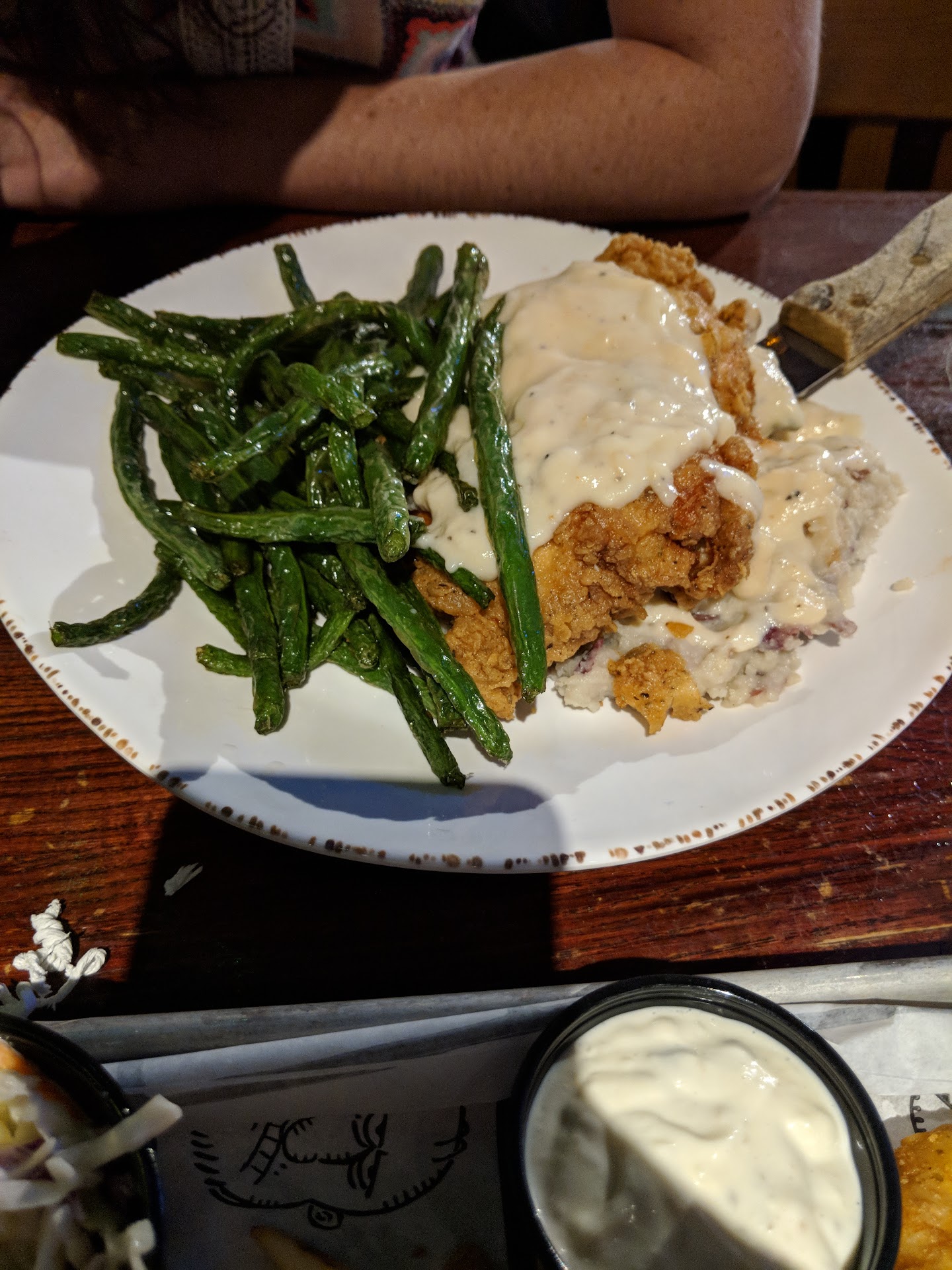 Read moreMy husband and I stumbled upon this place during a night at Pier Park. We were there at dinner time approx. 6:30PM. We were so excited with the concept but our experience immediately went down hill. We were instructed to sit at a table that we could not physically get to because teenagers from another table were hanging through the inside/outside window opening and blocking our table. My husband and I are in our twenties ourselves and we didn't want to be a buzz kill, so we sat ourself at the adjacent table. Unfortunately for us, our table was cleared but the paper looked used with big chucks missing from the paper table cloth and it had grease stains. Our waitress came and introduced herself and explained the atmosphere. We were excited to try the food. Our waitress asked us several times if we wanted fried pickles and we said "no thanks" and asked for the fondu instead. We don't enjoy pickles. This was our last night of vacation and we really just wanted to relax and have a fun dinner. Well, our appetizer came and our waitress ordered the fried pickles for us instead of what we asked for. I am not sure if it was the long day in the sun or the fact that we were absolutely starving and were unsure how far the "acting" went at the restaurant. Do they take your order and then you get whatever they decide to bring to your table? We ate a couple of the pickles, which I am sure were great but my husband and I really hate pickles. We asked for the check instead of ordering anything else and of course got flack from the waitress because, well that's her job. We left our waitress a 70% tip because she really played the part well and asked us for extra money to "help her stay...