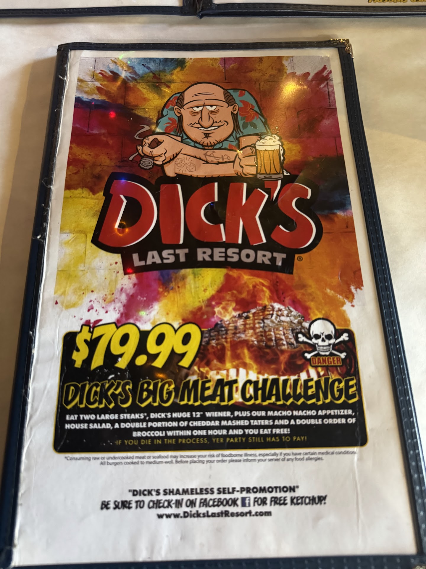 Me and my daughter along with three other family members came here for dinner. Food was great and all but our waitress wasnât much fun and didnât have a single conversation with us beyond the usual scripted âdonât ask for anything elseâ âwhat do you wantâ and slapping our menus down, which is normal but beyond those small things she didnât talk to us at all. Another thing I wanted to add was that our hats were pretty funny aside from my daughters, who is 16 and was the only minor at the table. She has had past struggles with acne and whatnot but is healed up now and working on fading the scars, so she still has some facial blemishes. So she was pretty crushed and later told me she was suppressing tears through her meal after she got her hat that said âperfect face for doggyâ. Which if you donât understand, means that she has the perfect face for that position because you donât have to look at it. Now when I read the hat I didnât understand the joke, but after she explained it to me I was in disbelief that someone would put that on a 16 year olds hat. This experience was nothing like past experiences at Dickâs in other states and whatnot. At other locations we had fun with the workers, made jokes and laughed together. At this place, none of that went on with our waitress. I understand making âfunnyâ hats is a part of their job but when youâre calling a kid hideous while also making up a scenario where theyâre in a sex position.. isnât funny, and isnât normal or ok. I like to glance around and read everyoneâs hats and after being to multiple Dickâs, I can confidently say that I have never seen such a personal, vulgar thing written on anyoneâs hat, especially a minorâs. Waitresses name was...