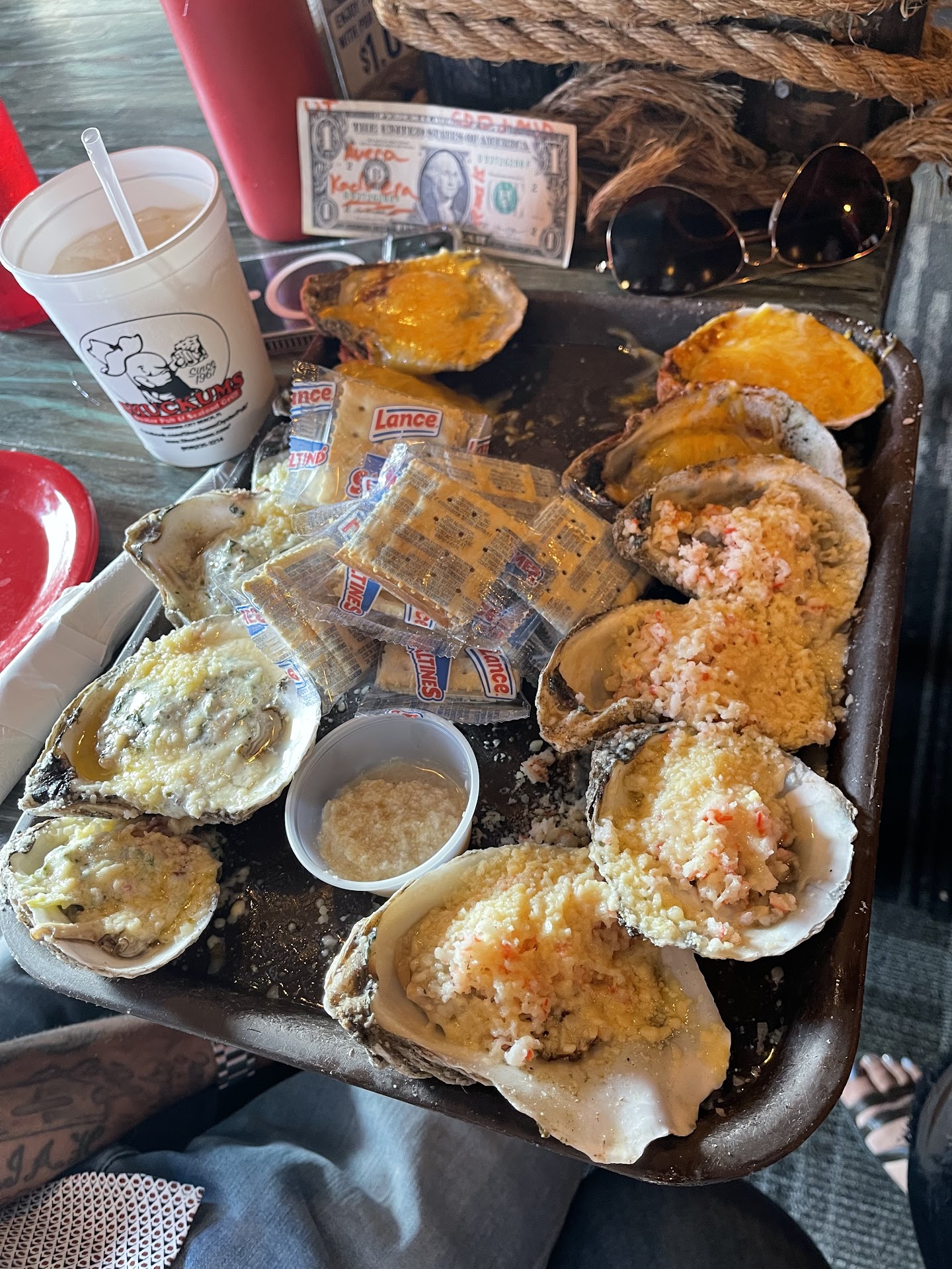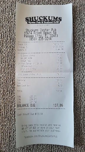 Read moreThis restaurant served us a martini in plastic cups. Well, you should price it like a plastic cup or warn that we don't serve $9 plus drinks in glasses. Stick with serving beer. The bartender doesn't know how to make drinks. I'm sorry, but this place is in business due to its location and proximity to an abundance of high-rise hotels and rental condominiums. The locals may drink here, but the smart ones don't eat here. I owned a place in PCB for 18 years and never stepped foot in this establishment, for good reason. This is Captain D's, but at 3 times the price. I ate here because my friend worked at the Port Authority 25 years ago and remembered ordering a blackened grouper sandwich. We ordered two grouper sandwiches and a grouper plate. By the way, the grouper was the fish of the day, or frozen fish of the day. The so-called grouper was so dry it was an embarrassment to charge $25 and serve it to patrons. The hush puppies were overcooked, dry, and very dark. Three people and a bill of $150. If you are near this area and want to walk to get drunk and don't care about food quality, then this is your place, because you won't have to drive drunk. Otherwise, if you want good food, please drive somewhere else, walk to Pier Park, or take the time to go back across the bridge to Panama City and find Places like Hunt's or The Captain's Table. Last thing, I am a salmon lover. The salmon dinner at Texas Roadhouse is hard to beat for quality and price. I didn't mean to insult Captain D's, and I did. But Captain D's is better. There are at least 25 better places to order seafood up and down the Panhandle than this establishment. Never again, and even if I were a guest of someone's, I wouldn't eat at this place. PCB is slowly losing the name Redneck Rivera, but this establishment is what reminds you of why that name developed and stuck around for so long. Shuckums is a place to drink beer and eat French fries and hamburgers. If that is your desire, you have...