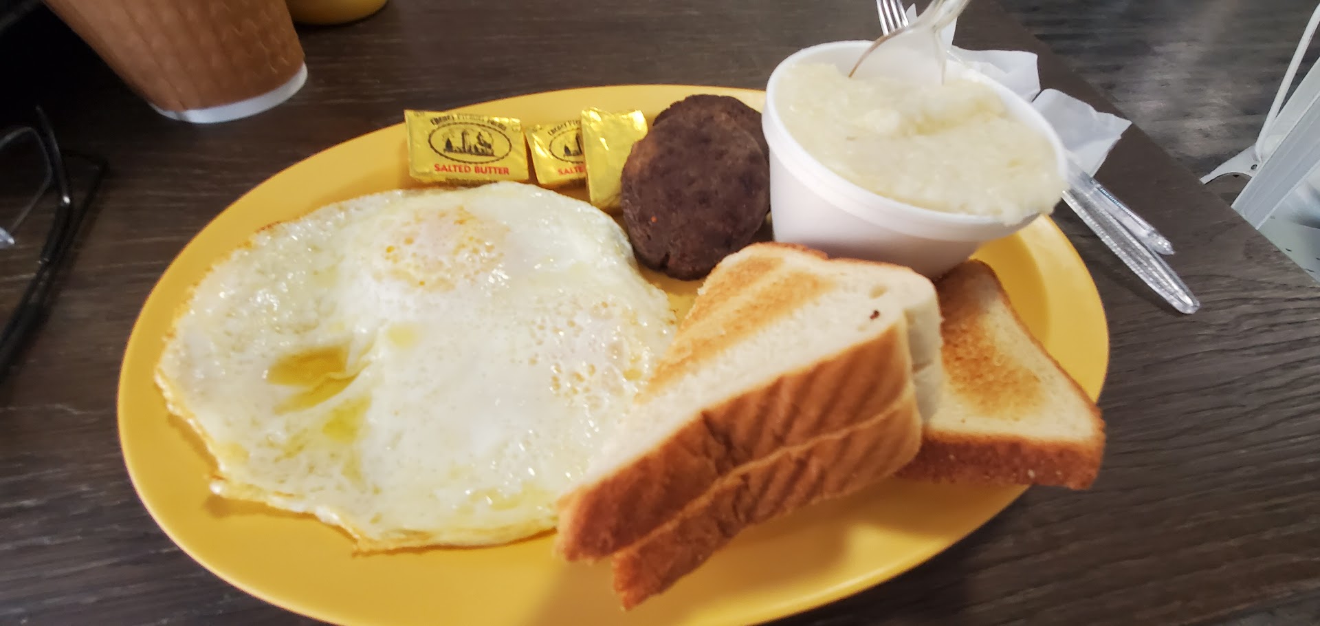 I ordered the traditional breakfast with 2 eggs over medium, sausage, grits and white toast. Eggs were over-easy not medium; the sausage was burned and hard like a hockey-puck, toast was cold, grits were good, though. I had a decaf coffee which was good. A server brought us our food; when I asked for cream and sugar she pointed to a counter across the room, which apparently meant I was to go get it. She was too busy chatting with a family that was eating there. Guess we weren't her type of customer or something, not sure.
