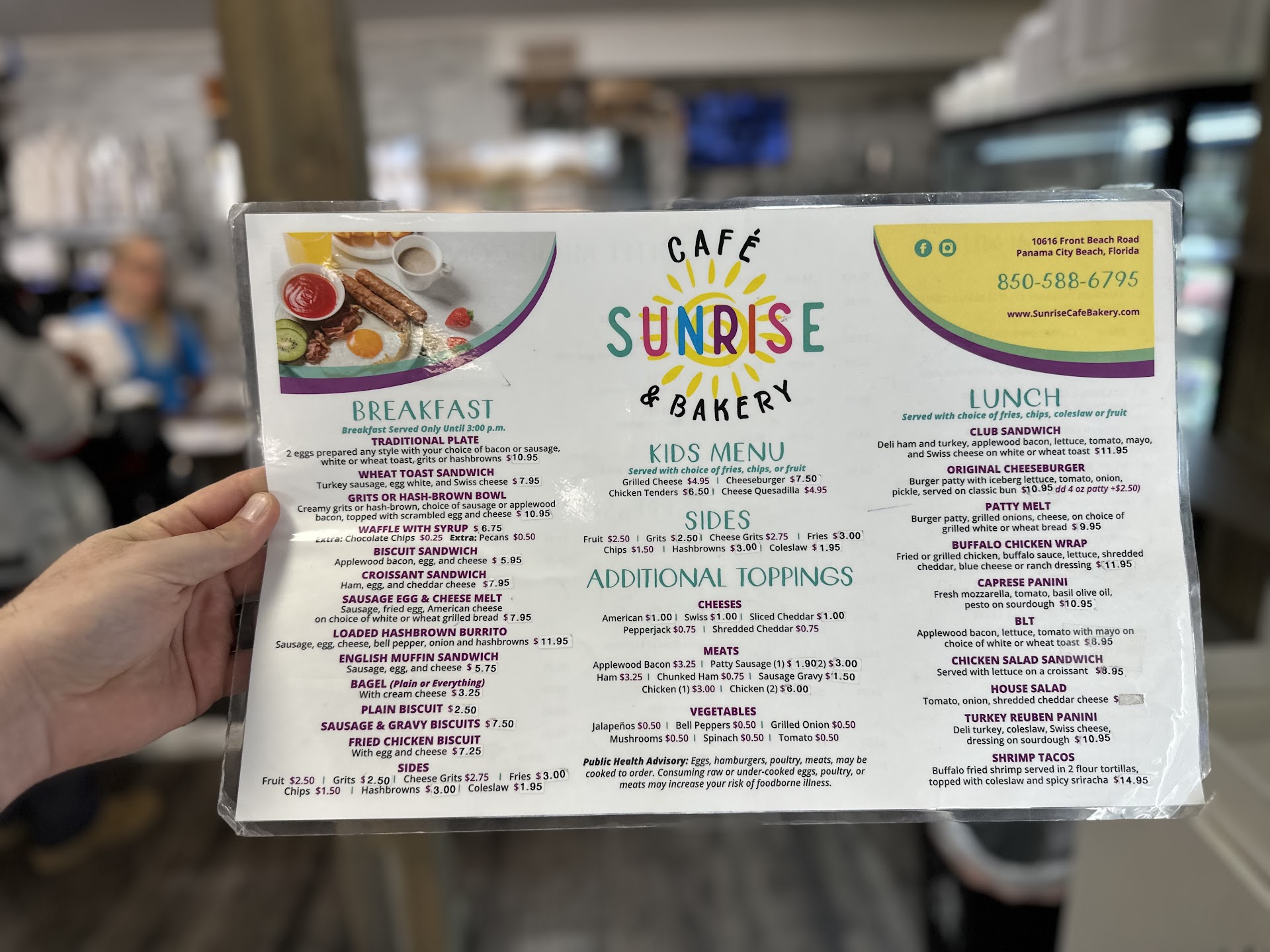 Read moreI initially was attracted to this place by the great reviews and the name of it - my grandparents who both passed used to live in the city of Sunrise in Broward County when they first moved to Florida over 30 years ago. Today was my second day having breakfast there with my family and this place does not disappoint. As a small business owner myself, I like supporting locally owned establishments as much as possible - Sunrise cafe is definitely one that deserves the abundance of support that it is getting. I actually was attended to by one of the owners who runs this establishment with their family. I was really impressed with how involved her kids were with delivering orders and keeping up with the cleanliness and overall appearance of the cafe. You can tell that even though they are young, they appreciate the hard work and dedication that their parents have put into their establishment. Both visits, my family and I enjoyed their fresh to order made breakfast meals, baked goods (unfortunately today at 10am they were already sold out of their fresh donuts), Milky Way latte, and their Mexican chocolate latte! We have been staying at the holiday inn resort which is about a two minute drive from there, however, we just walked on both occasions since we knew that the parking at Sunrise Café was limited (it’s about a 10 minute walk from the resort so not that long), plus after eating all that amazing food we needed to walk off those calories before heading to the beach. Whenever we come back to PCB, we will always remote to patronize this...